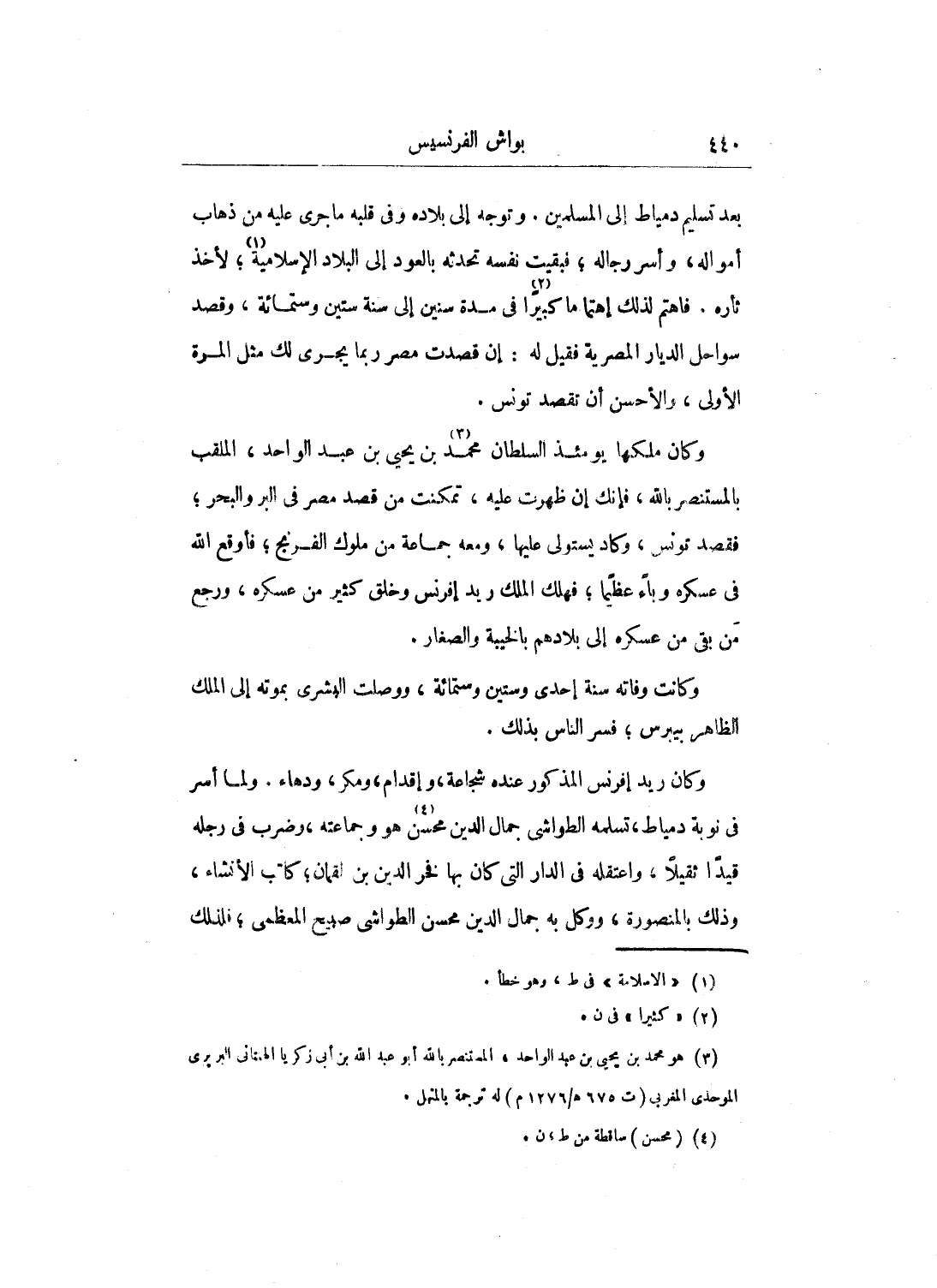 وكان ملكها يومئذ السلطان محمد بن يحيى بن عبد الواحد، الملقب بالمستنصر بالله، فإنك إن ظهرت عليه، تمكنت من قصد مصر في البر والبحر؛ فقصد تونس، وكاد يستولي عليها، ومعه جماعة من ملوك الفرنج؛ فأوقع الله في عسكره وباءً عظيماً؛ فهلك الملك ريد إفرنس وخلق كثير من عسكره، ورجع من بقي من عسكره إلى بلادهم بالخيبة والصغار.