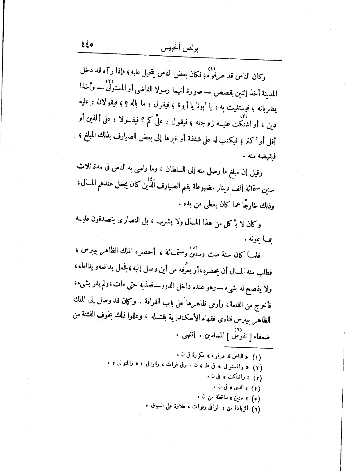 فلما كان سنة ست وستين وستمائة، أحضره الملك الظاهر بيبرس؛ فطلب منه المال أن يحضره، أو يعرفه من أين وصل إليه؛ فجعل يدافعه ويغالطه، ولا يفصح له بشيء - وهو عنده داخل الدور - فعذبه حتى مات، ولم يقر بشيء، فأخرج من القلعة، وأرمى ظاهرها على باب القرافة. وكان قد وصل إلى الملك الظاهر بيبرس فتاوى فقهاء الإسكندرية بقتله، وعللوا ذلك بخوف الفتنة من ضعفاء نفوس المسلمين. انتهى.