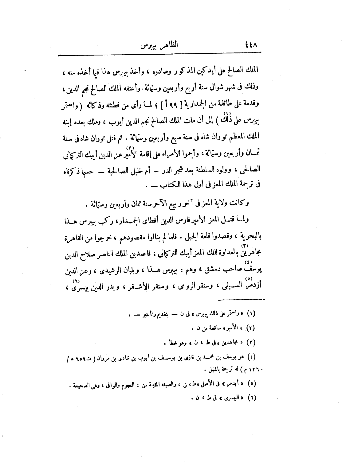 الملك الصالح على أيدكين المذكور وصادره، وأخذ بيبرس هذا فيما أخذه منه، وذلك في شهر شوال سنة أربع وأربعين وستمائة. وأعتقه الملك الصالح نجم الدين، وقدمه على طائفة من الجمدارية؛ لما رأى من فطنته وذكائه واستمر بيبرس على ذلك إلى أن مات الملك الصالح نجم الدين أيوب، وملك بعده ابنه الملك المعظم توران شاه في سنة سبع وأربعين وستمائة. ثم قتل توران شاه في سنة ثمان وأربعين وستمائة، وأجمعوا الأمراء على إقامة الأمير عز الدين أيبك التركماني الصالحي، وولوه السلطنة بعد شجر الدر - أم خليل الصالحية - حسبما ذكرناه في ترجمة الملك المعز في أول هذا الكتاب -.