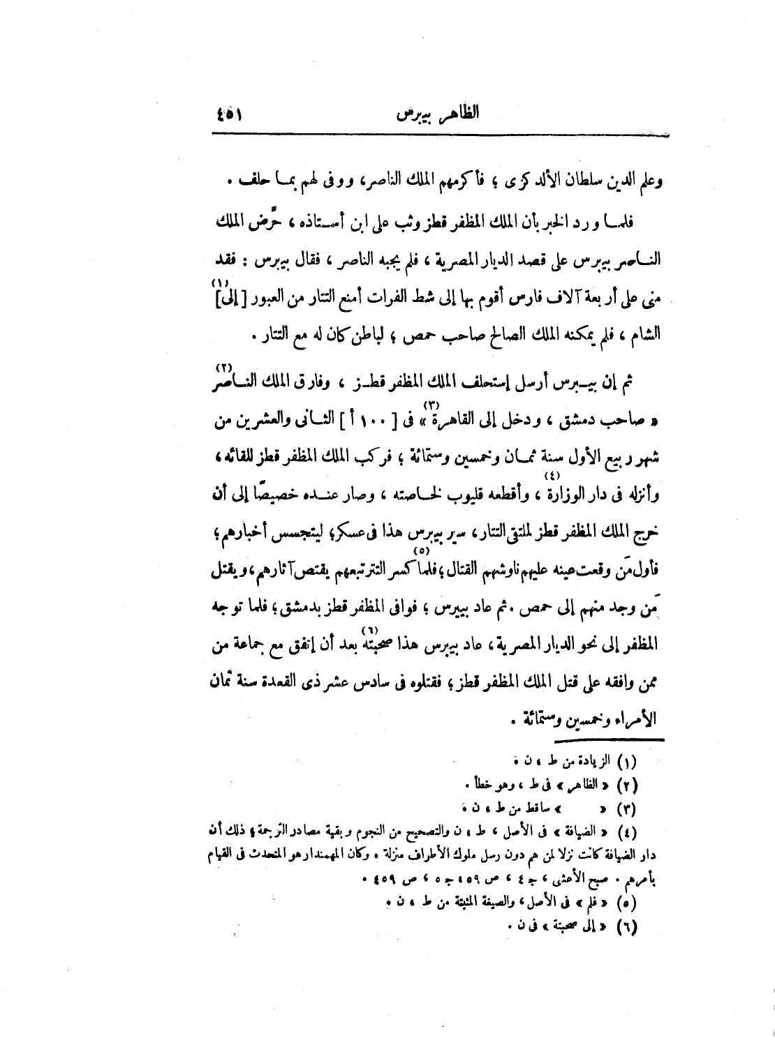ثم إن بيبرس أرسل استحلف الملك المظفر قطز، وفارق الملك الناصر صاحب دمشق، ودخل إلى القاهرة في الثاني والعشرين من شهر ربيع الأول سنة ثمان وخمسين وستمائة؛ فركب الملك المظفر قطز للقائه، وأنزله في دار الوزارة، وأقطعة قليوب لخاصته، وصار عنده خصيصاً إلى أن خرج الملك المظفر قطز لملتقى التتار، سير بيبرس هذا في عسكر؛ ليتجسس أخبارهم؛ فأول من وقعت عينه عليهم ناوشهم القتال؛ فلما كسر التتر تبعهم يقتص آثارهم، ويقتل من وجد منهم إلى حمص. ثم عاد بيبرس؛ فوافى المظفر قطز بدمشق؛ فلما توجه المظفر إلى نحو الديار المصرية، عاد بيبرس هذا صحبته بعد أن اتفق مع جماعة من ممن وافقه على قتل الملك المظفر قطز؛ فقتلوه في سادس عشر ذي القعدة سنة ثمان وخمسين وستمائة.