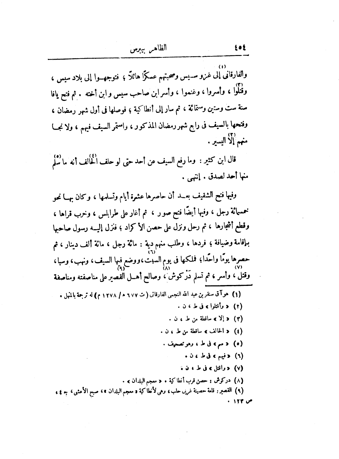 والفارقاني إلى غزو سيس وصحبتهم عسكراً هائلاً؛ فتوجهوا إلى بلاد سيس، وقتلوا، وأسروا، وغنموا، وأسر ابن صاحب سيس وابن أخته. ثم فتح يافا سنة ست وستين وستمائة، ثم سار إلى أنطاكية؛ فوصلها في أول شهر رمضان، وفتحها بالسيف في رابع شهر رمضان المذكور، واستمر السيف فيهم، ولا نجا منهم إلا اليسير.