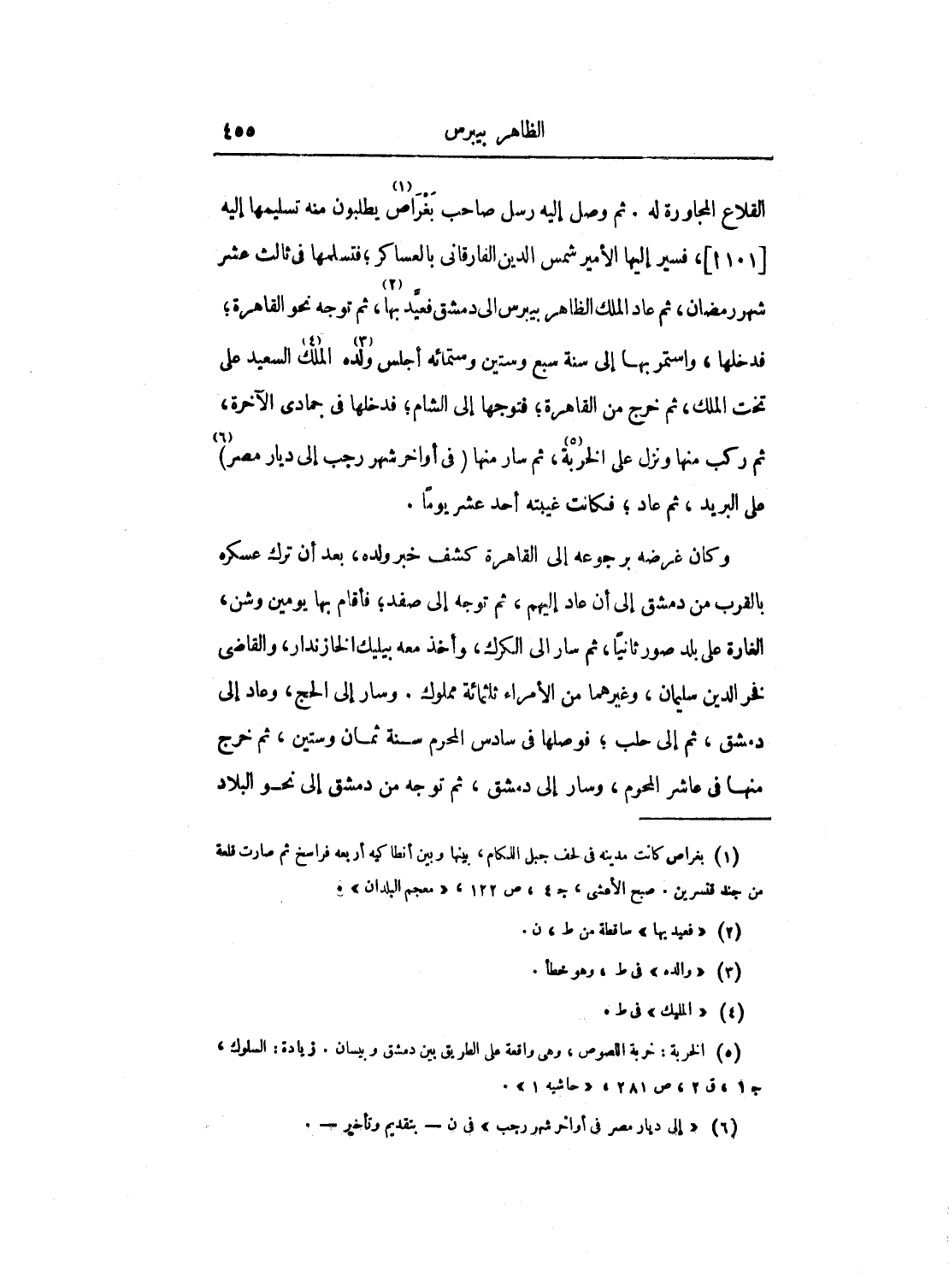 القلاع المجاورة له. ثم وصل إليه صاحب بغراص يطلبون منه تسليمها إليه، فسير إليها الأمير شمس الدين الفارقاني بالعساكر؛ فتسلمها في ثالث عشر شهر رمضان، ثم عاد الملك الظاهر بيبرس إلى دمشق فعيد بها، ثم توجه نحو القاهرة؛ فدخلها، واستمر بها إلى سنة سبع وستين وستمائة أجلس ولده الملك السعيد على تخت الملك، ثم خرج من القاهرة؛ فتوجها إلى الشام؛ فدخلها في جمادى الآخرة، ثم ركب منها ونزل على الخربة، ثم سار منها في أواخر شهر رجب إلى ديار مصر على البريد، ثم عاد؛ فكانت غيبته أحد عشر يوماً.