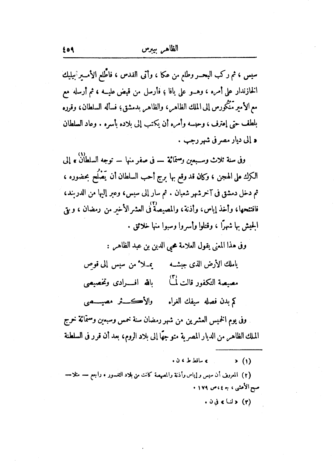 سيس، ثم ركب البحر وطلع من عكا، وأتى القدس، فاطلع الأمير بيليك الخازندار على أمره، وهو على يافا؛ فأرسل من قبض عليه، ثم أرسله مع الأمير منكورس إلى الملك الظاهر، والظاهر بدمشق؛ فسأله السلطان، وقرره بلطف حتى اعترف، وحبسه وأمره أن يكتب إلى بلاده بأسره. وعاد السلطان إلى ديار مصر في شهر رجب.