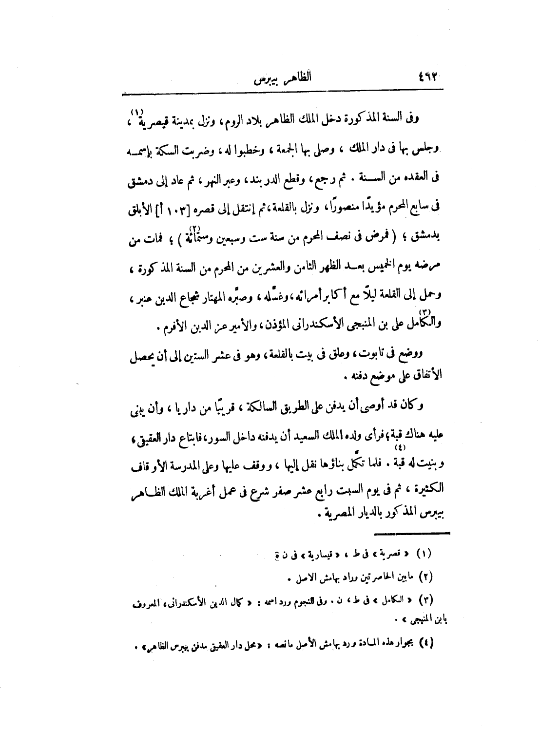 وفي السنة المذكورة دخل الملك الظاهر بلاد الروم، ونزل بمدينة قيصرية، وجلس بها في دار الملك، وصلى بها الجمعة، وخطبوا له، وضربت السكة باسمه في القعدة من السنة. ثم رجع، وقطع الدربند، وعبر النهر، ثم عاد إلى دمشق في سابع المحرم مؤيداً منصوراً، ونزل بالقلعة، ثم انتقل إلى قصره الأبلق بدمشق؛ فمرض في نصف المحرم من سنة ست وسبعين وستمائة؛ فمات من مرضه يوم الخميس بعد الظهر الثامن والعشرين من المحرم من السنة المذكورة، وحمل إلى القلعة ليلاً مع أكابر أمرائه، وغسله، وصبره المهتار شجاع الدين عنبر، والكامل علي بن المنبجي الإسكندراني المؤذن، والأمير عز الدين الأفرم.