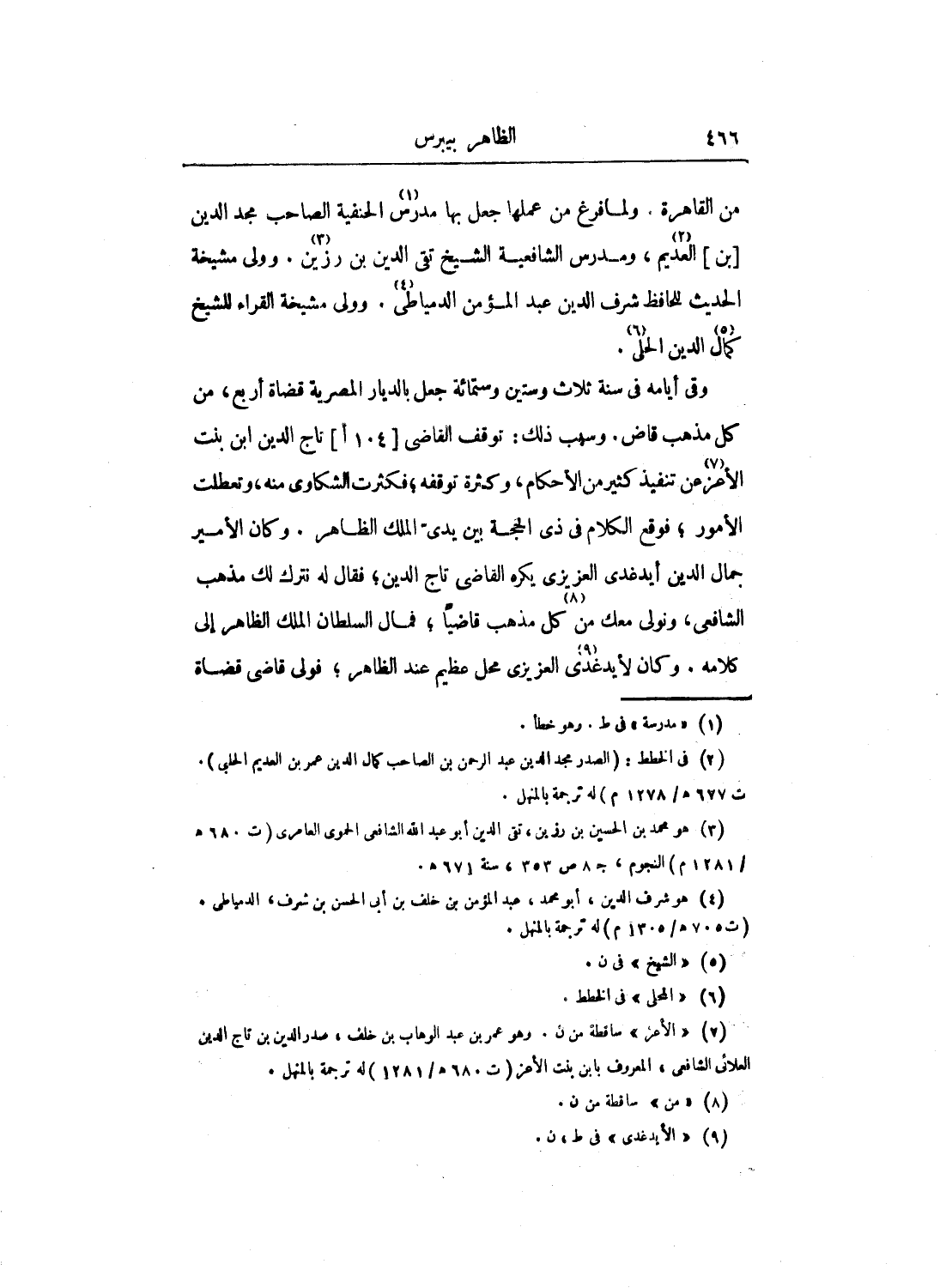 وفي أيامه في سنة ثلاث وستين وستمائة جعل بالديار المصرية قضاة أربع، من كل مذهب قاض. وسبب ذلك: توقف القاضي تاج الدين ابن بنت الأعز عن تنفيذ كثير من الأحكام، وكثرة توقفه؛ فكثرت الشكاوى منه، وتعطلت الأمور؛ فوقع الكلام في ذي الحجة بين يدي الملك الظاهر. وكان الأمير جمال الدين أيدغدي العزيزي يكره القاضي تاج الدين؛ فقال له نترك لك مذهب الشافعي، ونولي معك من كل مذهب قاضياً؛ فمال السلطان الملك الظاهر إلى كلامه. وكان لأيدغدي العزيزي محل عظيم عند الظاهر؛ فولى قاضي قضاة