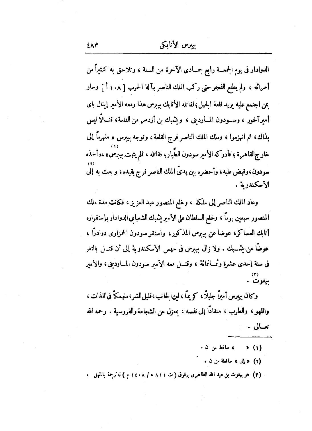 الدوادار في يوم الجمعة رابع جمادى الآخرة من السنة، وتلاحق به كثيراً من أمرائه، ولم يطلع الفجر حتى ركب الملك الناصر بآلة الحرب وسار بمن اجتمع عليه يريد قلعة الجبل؛ فقاتله الأتابك بيبرس هذا ومعه الأمير إينال باي أمير آخور، وسودون المارديني، ويشبك بن أزدمر من القلعة، قتالاً ليس بذاك، ثم انهزموا، وملك الملك الناصر فرج القلعة، وتوجه بيبرس منهزماً إلى خارج القاهرة؛ فأدركه الأمير سودون الطيار؛ فقاتله، فلم يثبت بيبرس، وأخذه سودون، وقبض عليه، وأحضره بين يدي الملك الناصر فرج بقيده، وبعث به إلى الإسكندرية.