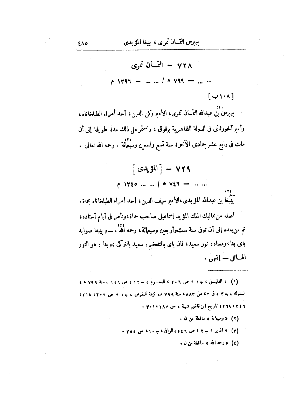 أصله من مماليك الملك المؤيد إسماعيل صاحب حماة، وتأمر في أيام أستاذه، ثم من بعده إلى أن توفى سنة ست وأربعين وسبعمائة، رحمه الله. - وبيبغا صوابه باي بغا، ومعناه: ثور سعيد، فإن باي بالتفخيم: سعيد بالتركي، وبغا: هو الثور الهائل - انتهى.