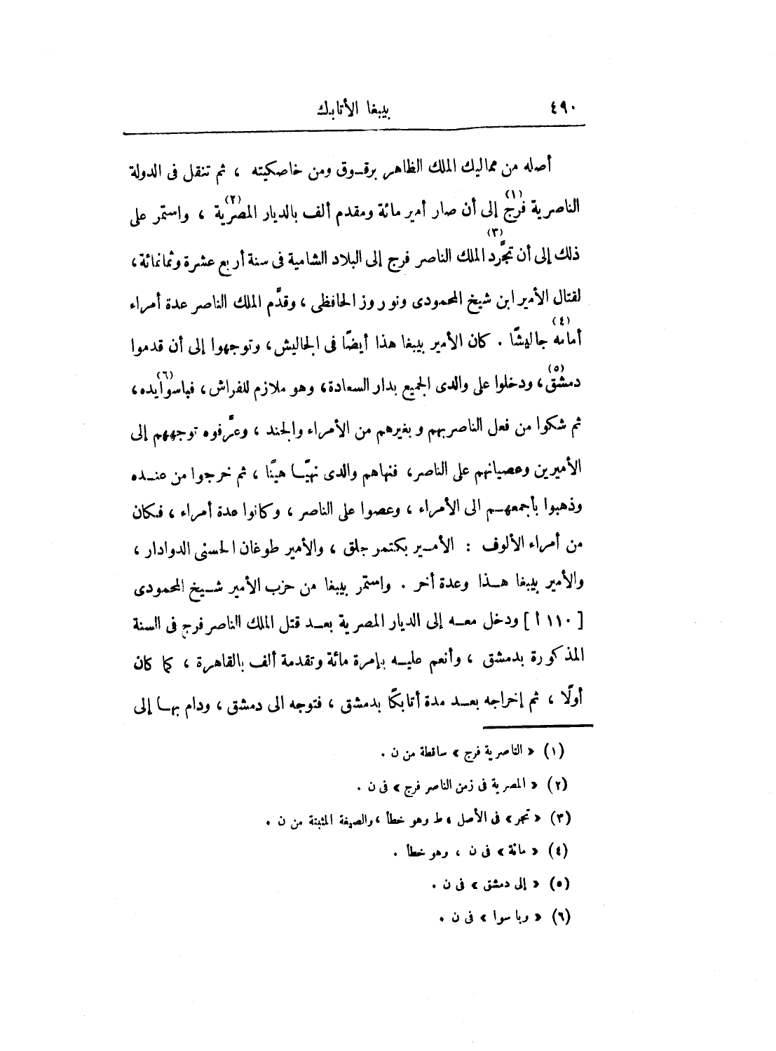 أصله من مماليك الملك الظاهر برقوق ومن خاصكيته، ثم تنقل في الدولة الناصرية فرج إلى أن صار أمير مائة ومقدم ألف بالديار المصرية، واستمر على ذلك إلى أن تجرد الملك الناصر فرج إلى البلاد الشامية في سنة أربع عشرة وثمانمائة، لقتال الأمير ابن شيخ المحمودي ونوروز الحافظي، وقدم الملك الناصر عدة أمراء أمامه جاليشاً. كان الأمير بيبغا هذا أيضاً في الجاليش، وتوجهوا إلى أن قدموا دمشق، ودخلوا على والدي الجميع بدار السعادة، وهو ملازم للفراش، فباسوا يده، ثم شكوا من فعل الناصر بهم وبغيرهم من الأمراء والجند، وعرفوه توجههم إلى الأميرين وعصيانهم على الناصر، فنهاهم والدي نهياً هيناً، ثم خرجوا من عنده وذهبوا بأجمعهم إلى الأمراء، وعصوا على الناصر، وكانوا عدة أمراء، فكان من أمراء الألوف: الأمير بكتمر جلق، والأمير طوغان الحسني الدوادار، والأمير بيبغا هذا وعدة أخر. واستمر بيبغا من حزب الأمير شيخ المحمودي ودخل معه إلى الديار المصرية بعد قتل الملك الناصر فرج في السنة المذكورة بدمشق، وأنعم عليه بإمرة مائة وتقدمة ألف بالقاهرة، كما كان أولاً، ثم إخراجه بعد مدة أتابكاً بدمشق، فتوجه إلى دمشق، ودام بها إلى