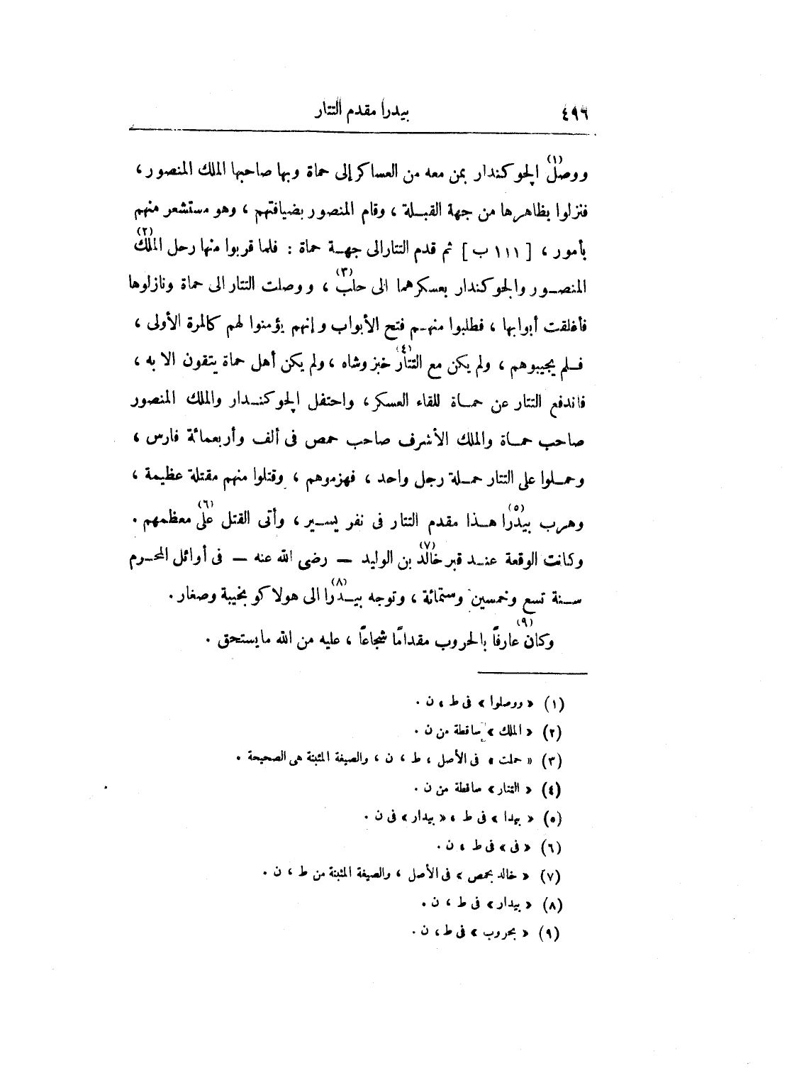 ووصل الجوكندار بمن معه من العساكر إلى حماة وبها صاحبها الملك المنصور، فنزلوا بظاهرها من جهة القبلة، وقام المنصور بضيافتهم، وهو مستشعر منهم بأمور، ثم قدم التتار إلى جهة حماة: فلما قربوا منها رحل الملك المنصور والجوكندار بعسكرهما إلى حلب، ووصلت التتار إلى حماة ونازلوها فأغلقت أبوابها، فطلبوا منهم فتح الأبواب وإنهم يؤمنوا لهم كالمرة الأولى، فلم يجيبوهم، ولم يكن مع التتار خبز وشاه، ولم يكن أهل حماة يتقون إلا به، فاندفع التتار عن حماة للقاء العسكر، واحتفل الجوكندار والملك المنصور صاحب حماة والملك الأشرف صاحب حمص في ألف وأربعمائة فارس، وحملوا على التتار حملة رجل واحد، فهزموهم، وقتلوا منهم مقتلة عظيمة، وهرب بيدرا هذا مقدم التتار في نفر يسير، وأتى القتل على معظمهم. وكانت الوقعة عند قبر خالد بن الوليد - رضي الله عنه - في أوائل المحرم سنة تسع وخمسين وستمائة، وتوجه بيدرا إلى هولاكو بخيبة وصغار.