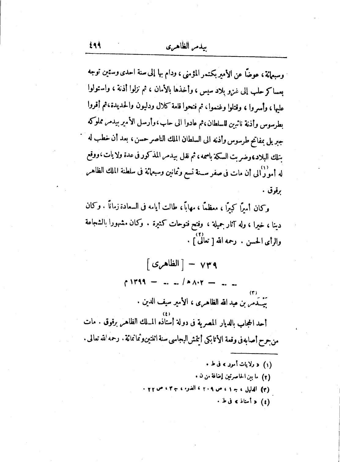 وسبعمائة، عوضاً عن الأمير بكتمر المؤمني، ودام بها إلى سنة إحدى وستين توجه بعساكر حلب إلى غزو بلاد سيس، وأخذها بالأمان، ثم نزلوا أذنة، واستولوا عليها، وأسروا، وقتلوا وغنموا، ثم فتحوا قلعة كلال ودليون والحديدة، ثم أقروا بطرسوس وأذنة نائبين للسلطان، ثم عادوا إلى حلب، وأرسل الأمير بيدمر مملوكه جبريل بمفاتح طرسوس وأذنه إلى السلطان الملك الناصر حسن، بعد أن خطب له بتلك البلاد، وضربت السكة باسمه، ثم نقل بيدمر المذكور في عدة ولايات، ووقع له أمور إلى أن مات في صفر سنة تسع وثمانين وسبعمائة في سلطنة الملك الظاهر برقوق.