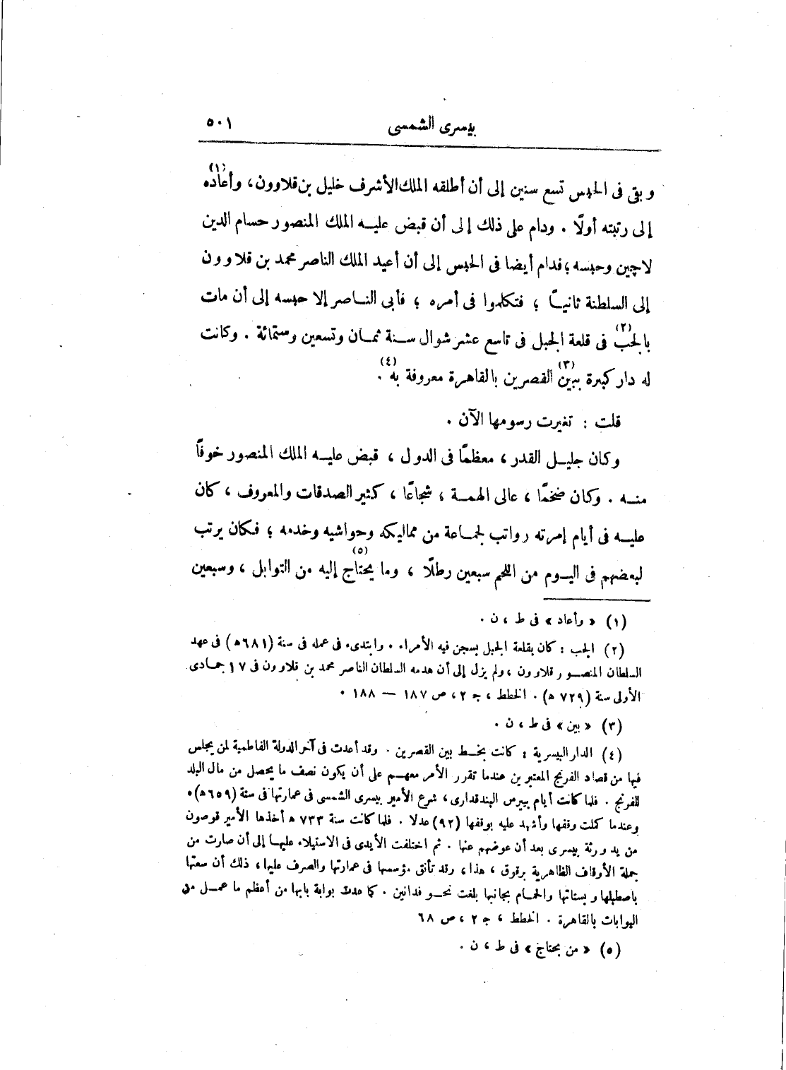 وكان جليل القدر، معظماً في الدول، قبض عليه الملك المنصور خوفاً منه. وكان ضخماً، عالي الهمة، شجاعاً، كثير الصدقات والمعروف، كان عليه في أيام إمرته رواتب لجماعة من مماليكه وحواشيه وخدمه؛ فكان يرتب لبعضهم في اليوم من اللحم سبعين رطلاً، وما يحتاج إليه من التوابل، وسبعين