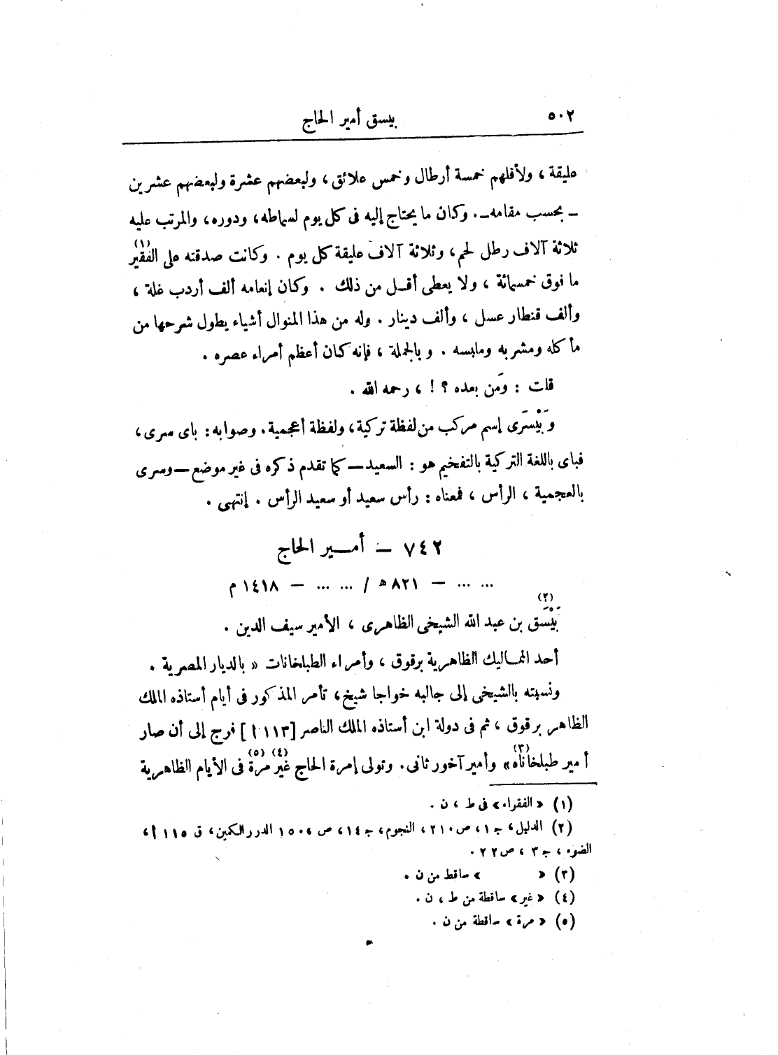 عليقة، ولأقلهم خمسة أرطال وخمس علائق، ولبعضهم عشرة ولبعضهم عشرين - بحسب مقامه -. وكان ما يحتاج إليه في كل يوم لسماطه، ودوره، والمرتب عليه ثلاثة آلاف رطل لحم، وثلاثة آلاف عليقة كل يوم. وكانت صدقته على الفقير ما فوق خمسمائة، ولا يعطي أقل من ذلك. وكان إنعامه ألف أردب غلة، وألف قنطار عسل، وألف دينار. وله من هذا المنوال أشياء يطول شرحها من مأكله ومشربه وملبسه. وبالجملة، فإنه كان أعظم أمراء عصره.
