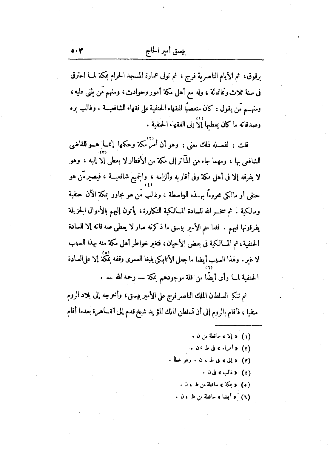 قلت: لفعله ذلك معنى: وهو أن أمر مكة وحكمها إنما هو للقاضي الشافعي بها، ومهما جاء من المآثر إلى مكة من الإفطار لا يعطى إلا إليه، وهو لا يفرقه إلا في أهل مكة وفي أقاربه وألزامه، والجميع شافعية، فيصير من هو حنفي أو مالكي محروماً بهذه الواسطة، وغالب من هو مجاور بمكة الآن حنفية ومالكية. ثم سخر الله للسادة المالكية التكاررة، يأتون إليهم بالأموال الجزيلة يفرقونها فيهم. فلما علم الأمير بيسق ما ذكرته صار لا يعطي صدقاته إلا للسادة الحنفية، ثم المالكية في بعض الأحيان، فتغير خواطر أهل مكة منه بهذا السبب لا غير. ولهذا السبب أيضاً ما جعل الأتابكي يلبغا العمري وقفه بمكة إلا على السادة الحنفية لما رأى أيضاً من قلة موجودهم بمكة - رحمه الله -.