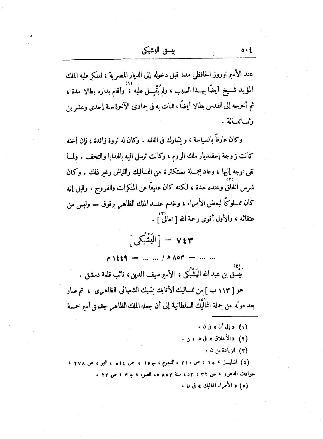 وكان عارفاً بالسياسة، ويشارك في الفقه. وكان له ثروة زائدة، فإن أخته كانت زوجة إسفنديار ملك الروم، وكانت ترسل إليه بالهدايا والتحف. ولما نفى توجه إليها، وعاد بجملة مستكثرة من المماليك والقماش وغير ذلك. وكان شرس الخلق وعنده حدة، لكنه كان عفيفاً عن المنكرات والفروج. وقيل إنه كان مملوكاً لبعض الأمراء، وخدم عند الملك الظاهر برقوق - وليس من عتقائه، والأول أقوى رحمه الله تعالى.