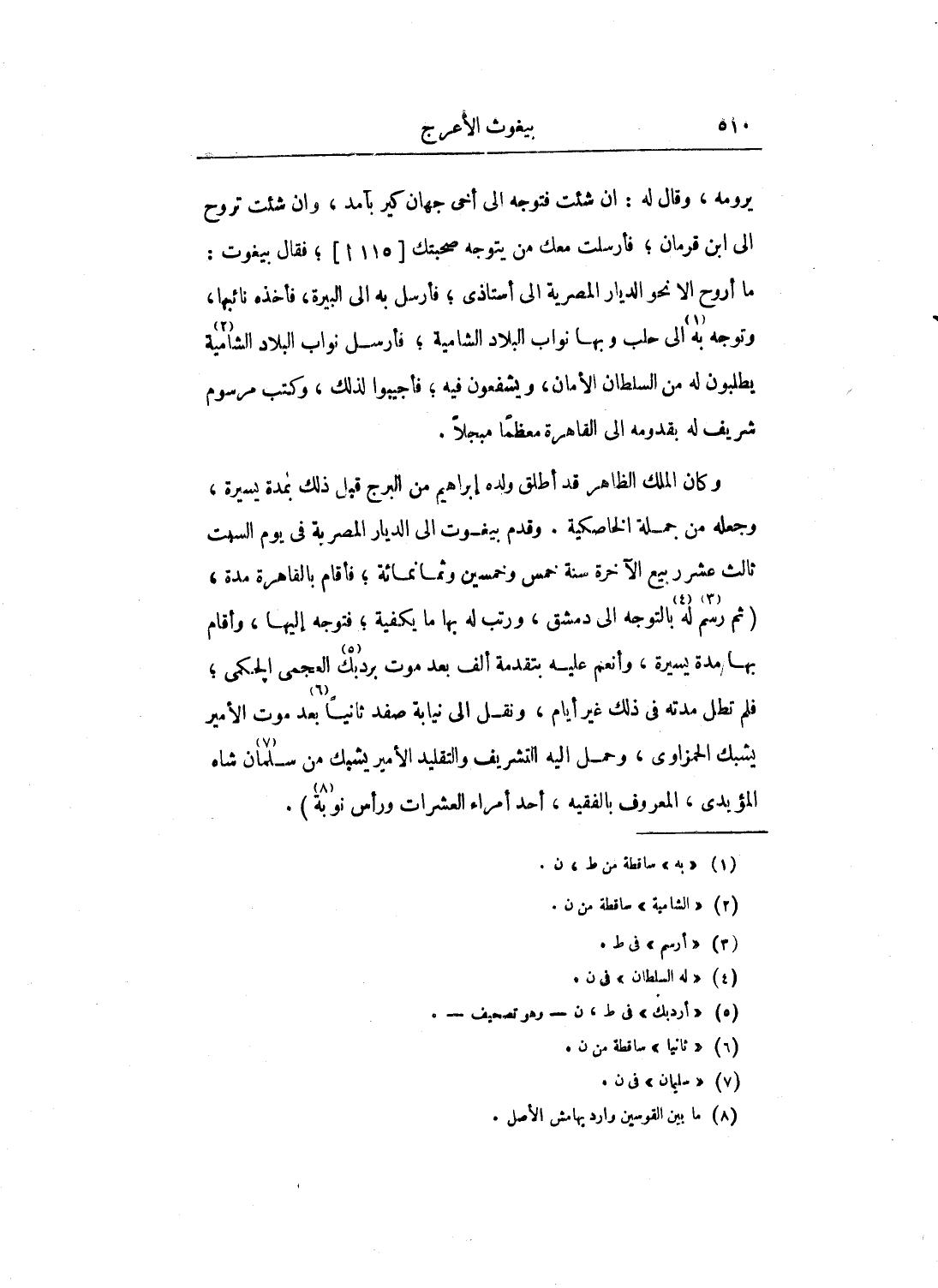 يرومه، وقال له: إن شئت فتوجه إلى أخي جهان كير بآمد، وإن شئت تروح إلى ابن قرمان؛ فأرسلت معك من يتوجه صحبتك؛ فقال بيغوت: ما أروح إلا نحو الديار المصرية إلى أستاذي؛ فأرسل به إلى البيرة، فأخذه نائبها، وتوجه به إلى حلب وبها نواب البلاد الشامية؛ فأرسل نواب البلاد الشامية يطلبون له من السلطان الأمان، ويشفعون فيه؛ فأجيبوا لذلك، وكتب مرسوم شريف له بقدومه إلى القاهرة معظماً مبجلاً.