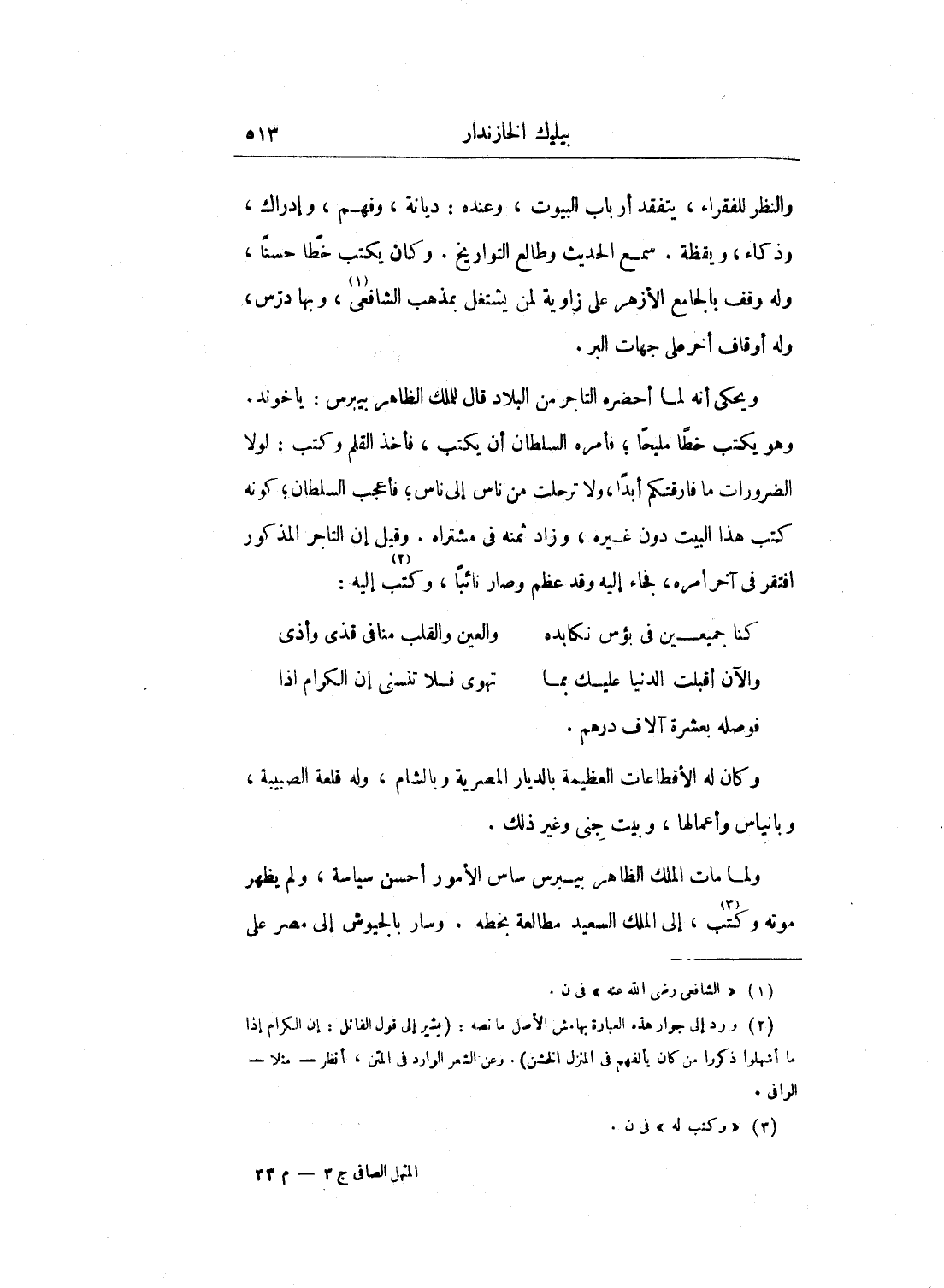 ويحكى أنه لما أحضره التاجر من البلاد قال للملك الظاهر بيبرس: يا خوند. وهو يكتب خطاً مليحاً؛ فأمره السلطان أن يكتب، فأخذ القلم وكتب: لولا الضرورات ما فارقتكم أبداً، ولا ترحلت من ناس إلى ناس؛ فأعجب السلطان؛ كونه كتب هذا البيت دون غيره، وزاد ثمنه في مشتراه. وقيل إن التاجر المذكور افتقر في آخر أمره، فجاء إليه وقد عظم وصار نائباً، وكتب إليه:
