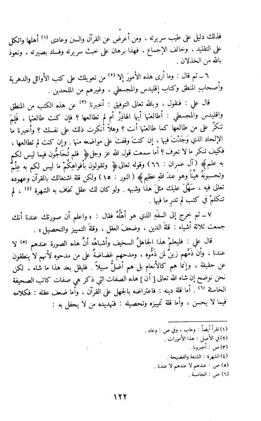 قال علي: فليعلم هذا الجاهل السخيف وأشباهه أن هذه الصورة عندهم (5) لا عندنا، وان ذمهم زين لمن ذموه، ومدحهم غضاضة على من مدحوه لأنهم لا ينطقون عن حقيقة، وإنما هم كالأنعام بل هم أضل سبيلاً. فليقل بعد ما شاء، لكن نحن نوضح إن شاء الله تعالى [أن] هذه الصفات التي ذكر هي صفات كاتب الصحيفة الخاسئة (6) . أما قلة دينه: فاعتراضه بالجهل على القرآن، وأما ضعف عقله: فكلامه فيما لا يحسن، وأما قلة تمييزه وتحصيله: فتهديده من لا يحفل به.