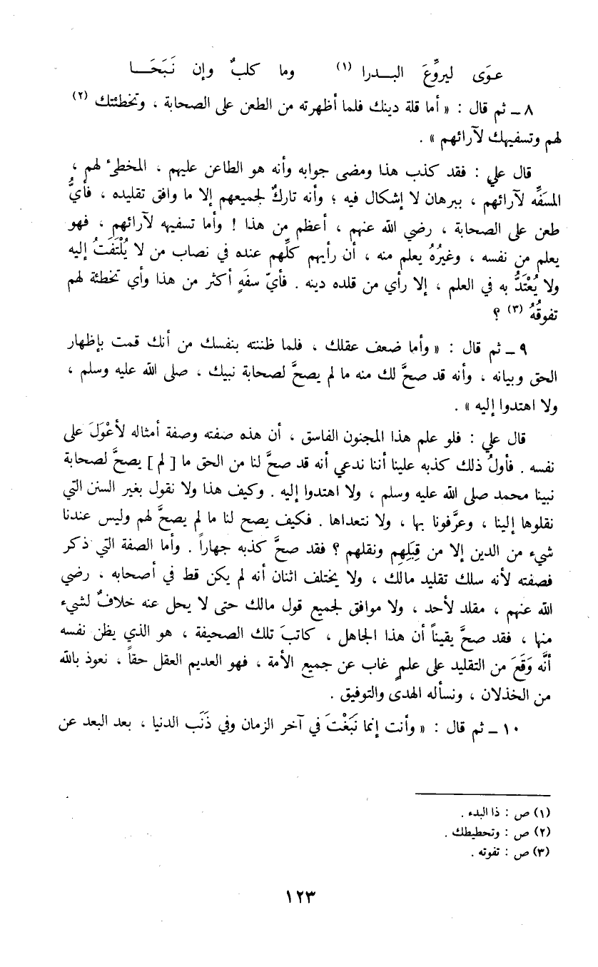 عوى ليروع البدرا (1) ... وما كلب وإن نبحا 8 - ثم قال: " أما قلة دينك فلما أظهرته من الطعن على الصحابة، وتخطئتك (2) لهم وتسفيهك لآرائهم ".