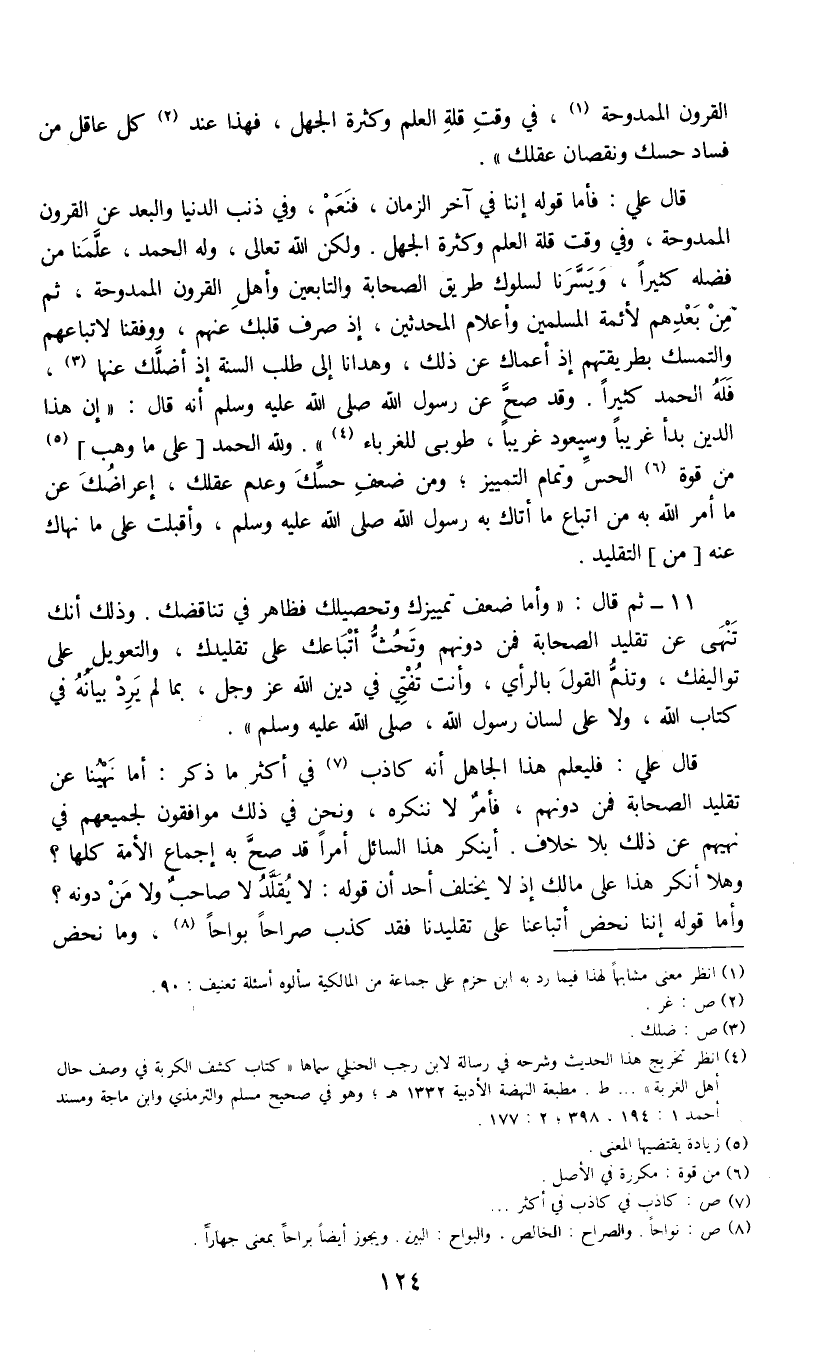 قال علي: فأما قوله إننا في آخر الزمان، فنعم، وفي ذنب الدنيا والبعد عن القرون الممدوحة، وفي وقت العلم وكثرة الجهل. ولكن الله تعالى، وله الحمد، علمنا من فضله كثيراً، ويسرنا لسلوك طريق الصحابة والتابعين وأهل القرون الممدوحة، ثم من بعدهم لأئمة المسلمين وأعلام المحدثين، إذ صرف قلبك عنهم، ووفقنا لاتباعهم والتمسك بطريقتهم إذ أعماك عن ذلك، وهدانا إلى طلب السنة إذ أضلك عنها (3) ، فله الحمد كثيراً. وقد صح عن رسول الله صلى الله عليه وسلم انه قال: " عن هذا الدين بدأ غريباً وسيعود غريباً، طوبى للغرباء (4) ". ولله الحمد [على ما وهب] (5) من قوة (6) الحس وتمام التمييز؛ ومن ضعف حسك وعدم عقلك، إعراضك عن ما أمر الله به من اتباع ما أتاك به رسول الله صلى الله عليه وسلم، وأقبلت على ما نهاك عنه [من] التقليد.