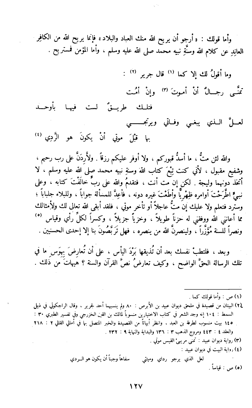 ص: آذاه. لعل الذي يبغي وفاتي ويرتجي ... (4) بها قبل موتي أن يكون هو الردي والله لئن مت، ما أسد قبوركم، ولا أوفر عليكم رزقاً. ولأردن على رب رحيم، وشفيع مقبول، لأني كنت تبع كتاب الله وسنة نبيه محمد صلى الله عليه وسلم، لا أتخذ دونهما وليجة. لكن إن مت انت، فتقدم والله على رب خالفت كتابه، وعلى نبي اطرحت أوامره ظهرياً وأطعت غيره دونه، فاعد للمسألة جواباً، وللبلاء جلباباً؛ وسترد فتعلم ولا عليك إن مت عاجلاً أو تأخر موتي، فلقد أبقى الله تعالى لك ولأمثالك مما أعانني الله ووفقني له حزناً طويلاً، وخزياً جزيلاً، وكسراً لكل رأي وقياس (5) ونصراً للسنة مؤزراً، ولينصرن الله من ينصره، فهل تربصون بنا إلا إحدى الحسنيين.