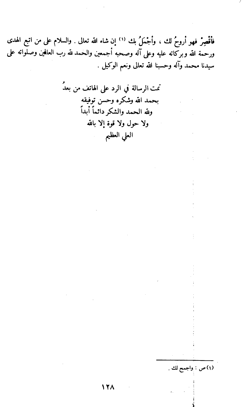 فأقصر فهو أروح لك، وأجمل بك (1) عن شاء الله تعالى. والسلام على من اتبع الهدى ورحمة الله وبركاته عليه وعلى آله وصحبه أجمعين والحمد لله رب العالمين وصلواته على سيدنا محمد وآله وحسبنا الله تعالى ونعم الوكيل.