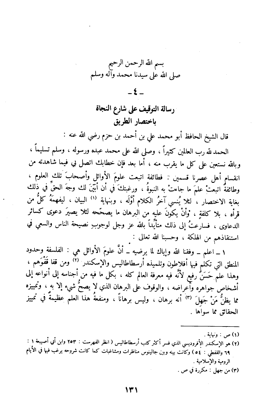 1 - اعلم - وفقنا الله وإياك لما يرضيه - أن علوم الأوائل هي: الفلسفة وحدود المنطق التي تكلم فيها أفلاطون وتلميذه أرسطاطاليس والإسكندر (2) ومن قفا قفوهم، وهذا علم حسن رفيع لأنه فيه معرفة العالم كله، بكل ما فيه من أجناسه إلى أنواعه إلى أشخاص جواهره وأعراضه، والوقوف على البرهان الذي لا يصح شيء إلا به، وتمييزه مما يظن من جهل (3) أنه برهان، وليس برهاناً، ومنفعة هذا العلم عظيمة في تمييز الحقائق مما سواها.