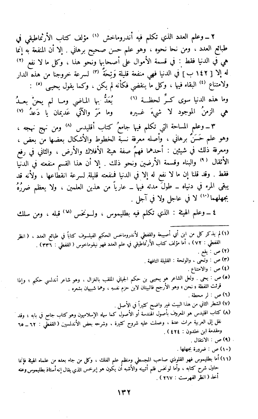 2 - وعلم العدد الذي تكلم فيه أندروماخش (1) مؤلف كتاب الأرثماطيقي في طبائع العدد، ومن نحا نحوه، وهو علم حسن صحيح برهاني. إلا أن المنفعة به إنما هي في الدنيا فقط: في قسمة الأموال على أصحابها ونحو هذا، وكل ما لا نفع (2) له إلا [142ب] في الدنيا فهي منفعة قليلة وتحة (3) لسرعة خروجنا من هذه الدار ولامتناع (4) البقاء فيها، وكل ما ينقضي فكأنه لم يكن، وكما يقول يحيى (5) :