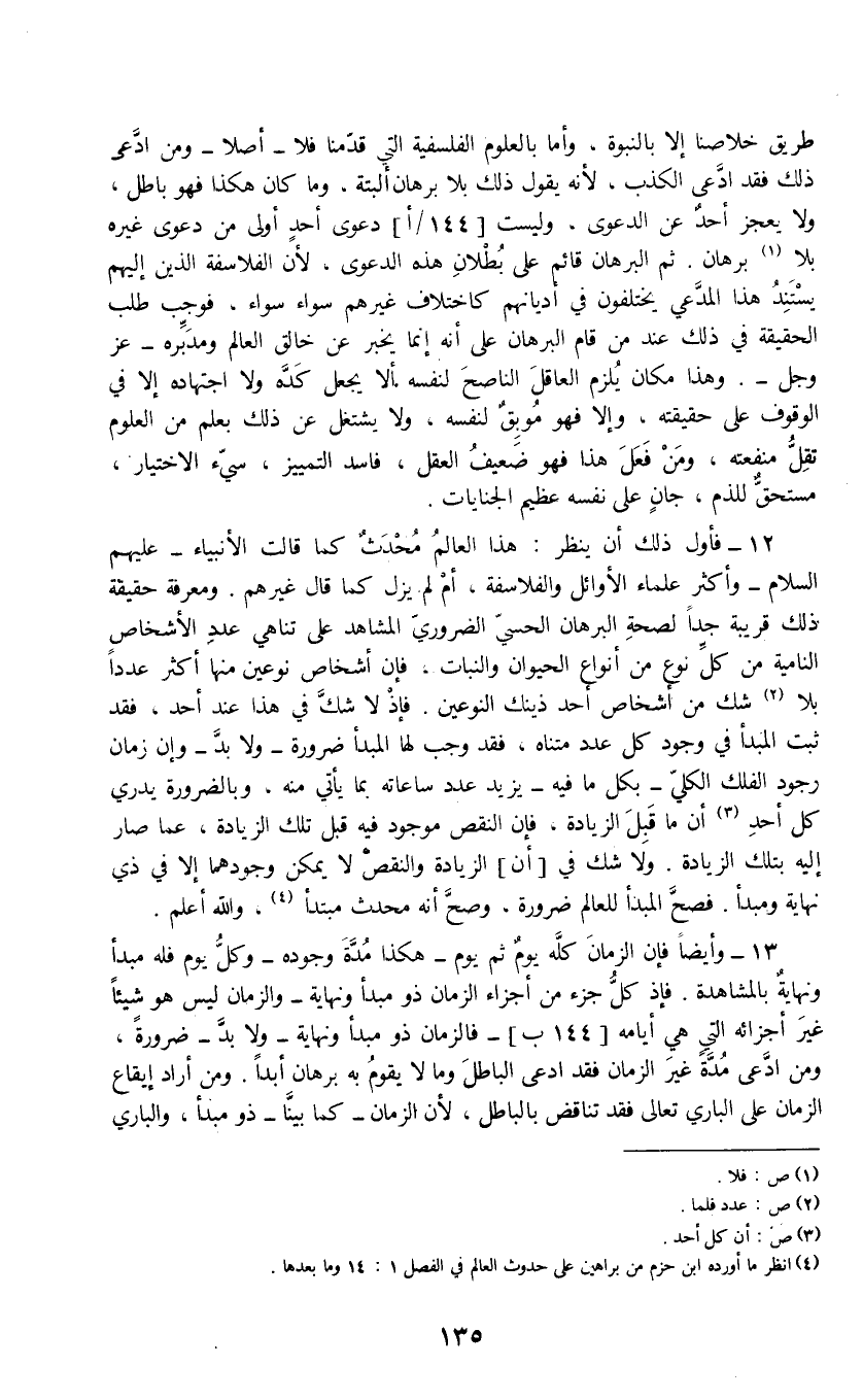 13 - وأيضاً فإن الزمان كله يوم ثم يوم - هكذا مدة وجوده - وكل يوم فله مبدأ ونهاية بالمشاهدة. فإذ كل جزء من أجزاء الزمان ذو مبدأ ونهاية - والزمان ليس هو شيئاً غير أجزائه التي هي أيامه [144 ب]- فالزمان ذو مبدأ ونهاية - ولابد - ضرورة، ومن ادعى مدة غير الزمان فقد ادعى الباطل وما لا يقوم به برهان أبداً. ومن أراد إيقاع الزمان على الباري تعالى فقد تناقض بالباطل، لأن الزمان - كما بينا - ذو مبدأ، والباري