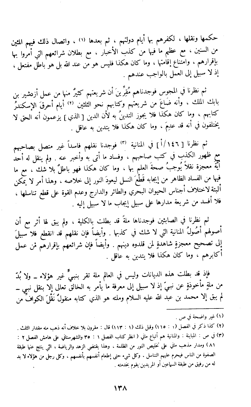 ثم نظرنا [146/أ] في المنانية (3) فوجدنا نقلهم فاسداً غير متصل بصاحبهم مع ظهور الكذب في كتب صاحبهم، وفساد ما أتى به وأخبر عنه. ولم ينقل له أحد أية معجزة نقلاً يوجب صحة العلم بها، وما كان هكذا فهو باطل بلا شك، مع ما فيها من الفساد الظاهر من إيجابه قطع النسل ليعود النور إلى خلاصه، وهذا أمر لا يمكن ألبتة لاختلاف أجناس الحيوان البحري والطائر والدارج وعدم القوة على قطع تناسلها، فلا أفسد من شريعة مدارها على سبيل إيجاب ما لا سبيل إليه.