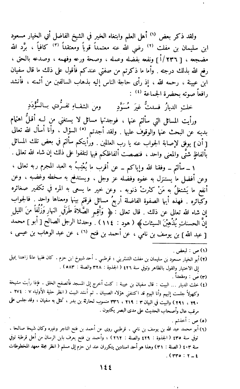 خلت الديار فسدت غير مسود ... ومن الشقاء تفردي بالسؤدد ورأيت المسائل التي سألتم عنها، فوجدتها مسائل لا يستغني من له أقل اهتمام بدينه عن البحث عنها والوقوف عليها. ولقد أجدتم (5) السؤال، وأنا أسأل الله تعالى [أن] يوفق لإصابة الجواب عنه يا رب العالمين. ورأيتكم سألتم في بعض تلك المسائل بألفاظ شتى والمعنى واحد، فنصصت ألفاظكم فيها لتقفوا على ذلك إن شاء الله تعالى.