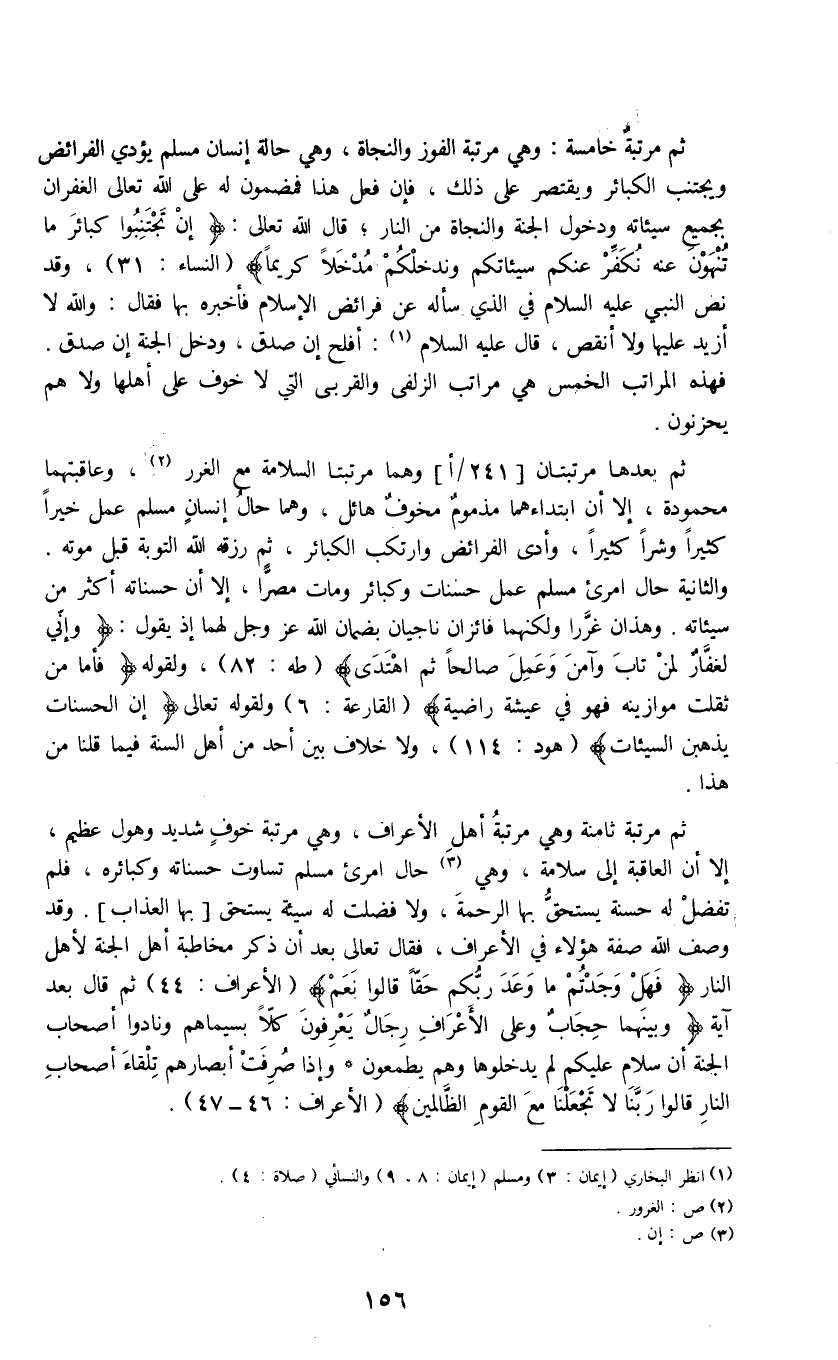 ثم مرتبة خامسة: وهي مرتبة الفوز والنجاة، وهي حالة إنسان مسلم يؤدي الفرائض ويجتنب الكبائر ويقتصر على ذلك، فإن فعل هذا فمضمون له على الله تعالى الغفران بجميع سيئاته ودخول الجنة والنجاة من النار؛ قال الله تعالى: {إن تجتنبوا كبائر مات تنهون عنه نكفر عنكم سيئاتكم وندخلكم مدخلاً كريماً} (النساء: 31) ، وقد نص النبي عليه السلام في الذي سأله عن فرائض الإسلام فأخبره بها فقال: والله لا أزيد عليها ولا أنقص، قال عليه السلام (1) : أفلح عن صدق، ودخل الجنة إن صدق. فهذه المراتب الخمس هي مراتب الزلفى والقربى التي لا خوف على أهلها ولا هم يحزنون.