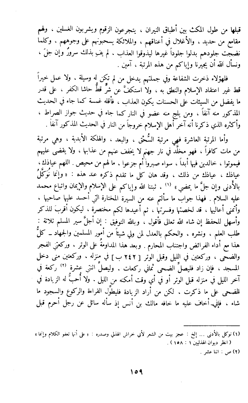 وأما المرتبة العاشرة فهي مرتبة السحق، والبعد، والهلكة الأبدية، وهي مرتبة من مات كافراً، فهو مخلد في نار جهنم لا يخفف عنهم من عذابها، ولا يقضي عليهم فيموتوا، خالدين فيها أبدا، سواء صبروا أم جزعوا، ما لهم من محيص. اللهم عياذك، عياذك، عياذك من ذلك، وقد هان كل ما تقدم ذكره عند هذه: " وإنما نوكل بالأدنى وإن جل ما يمضي " (1) ، ثبتنا الله وإياكم على الإسلام والإيمان وابتاع محمد عليه السلام. فهذا جواب ما سألتم عنه من السيرة المختارة التي أحسد عليها صاحبها، وأتمنى أعاليها، قد لخصتها وفسرتها، ثم أعيدها لكم مختصرة، ليكون أقرب للذكر وأسهل للحفظ إن شاء الله تعالى فأقول، وبالله التوفيق: إن أجل سير المسلم ثلاثة: طلب العلم، ونشره، والحكم بالعدل لمن ولي شيئاً من أمور المسلمين والجهاد - كل هذا مع أداء الفرائض واجتناب المحارم. وبعد هذا المداومة على الوتر، وركعتي الفجر والضحى، وركعتين في الليل وقبل الوتر [242 ب] في منزله، وركعتين متى دخل المسجد، فإن زاد فليصل الضحى ثماني ركعات، وليصل اثنتي عشرة (2) ركعة في آخر الليل في منزله قبل الوتر أو في أي وقت أمكنه من الليل، ولا أحب له الزيادة في الضحى على ما ذكرت، لكن من أراد الزيادة فليطول القراءة والركوع والسجود ما شاء، فإني أخاف عليه ما خافه مالك بن أنس إذ سأله سائل عن رجل أحرم قبل