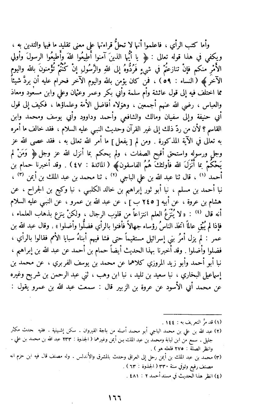 وأما كتب الرأي، فاعلموا أنها لا تحل قراءتها على معنى تقليد ما فيها والتدين به، ويكفي في هذا قوله تعالى: {يا أيها الذين آمنوا أطيعوا الله وأطيعوا الرسول وأولي الأمر منكم فإن تنازعتم في شيء فردوه إلى الله والرسول عن كنتم تؤمنون بالله واليوم الآخر} (النساء: 59) ، فمن كان يؤمن بالله واليوم الآخر فحرام عليه أن يرد شيئاً مما اختلف فيه إلى قول عائشة وأم سلمة وأبي بكر وعمر وعثمان وعلي وابن مسعود ومعاذ والعباس، رضي الله عنهم أجمعين، وهؤلاء أفاضل الأمة وعلماؤها، فكيف إلى قول أبي حنيفة وإلى سفيان ومالك والشافعي وأحمد وداوود وأبي يوسف ومحمد وابن القاسم لان من رد ذلك إلى غير القرآن وحديث النبي عليه السلام، فقد خالف ما أمره به تعالى في الآية المذكورة. ومن لم [يفعل] ما أمر الله تعالى به، فقد عصى الله عز وجل ورسوله واستحق أقبح الصفات، ولم يحكم بما أنزل الله عز وجل {ومن لم يحكم بما انزل الله فأولئك هم الفاسقون} (المائدة: 47) . وقد أخبرنا حمام بن أحمد (1) ، قال ثنا عبد الله بن علي الباجي (2) ، ثنا محمد بن عبد الملك بن أيمن (3) ، نبا أحمد بن مسلم، نبا أبو ثور إبراهيم بن خالد الكلبي، نبا وكيع بن الجراح، عن هشام بن عروة، عن أبيه [245 ب] ، عن عبد الله بن عمرو، عن النبي عليه السلام أنه قال (4) : " لا ينزع العلم انتزاعاً من قلوب الرجال، ولكن ينزع بذهاب العلماء، فإذا لم يبق عالماً اتخذ الناس رؤساء جهالاً فأفتوا بالرأي فضلوا وأضلوا ". وقال عبد الله بن عمر: لم يزل أمر بني إسرائيل مستقيماً حتى فشا فيهم أبناء سبايا الأمم فقالوا بالرأي، فضلوا وأضلوا. وقد أخبرنا بهذا الحديث أيضاً حمام بن أحمد بن عبد الله بن إبراهيم، نبا أبو أحمد وأبو زيد المروزي كلاهما عن محمد بن يوسف الفربري، عن محمد بن إسماعيل البخاري، نبا سعيد بن تليد، نبا ابن وهبن ثني عبد الرحمن بن شريح وغيره عن محمد أبي الأسود عن عروة بن الزبير قال: سمعت عبد الله بن عمرو يقول:
