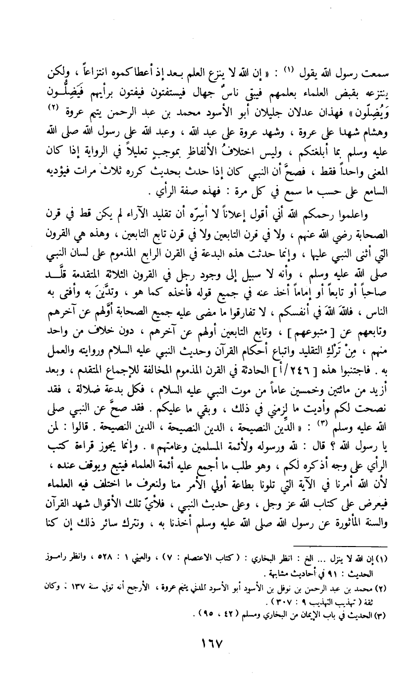 سمعت رسول الله يقول (1) : " إن الله لا ينزع العلم بعد إذ أعطاكموه انتزاعاً، ولطكن ينتزعه بقبض العلماء بعلمهم فيبقى ناس جهال فيستفتون فيفتون برأيهم فيضلون ويضلون " فهذان عدلان جليلان أبو الأسود محمد بن عبد الرحمن يتيم عروة (2) وهشام شهدا على عروة، وشهد عروة على عبد الله، وعبد الله على رسول الله صلى الله عليه وسلم بما أبلغتكم، وليس اختلاف الألفاظ بموجب تعليلاً في الرواية إذا كان المعنى واحداً فقط، فصح ان النبي كان إذا حدث بحديث كرره ثلاث مرات فيؤديه السامع على حسب ما سمع في كل مرة: فهذه صفة الرأي.
