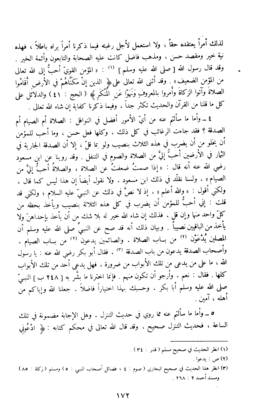 4 - وأما ما سألتم عنه من أي الأمور أفضل في النوافل: الصلاة أم الصيام أم الصدقة فقد جاءت الرغائب في كل ذلك، وكلها فعل حسن، وما أحب للمؤمن أن يخلو من أن يضرب في هذه الثلاث بنصيب ولو بما قل، إلا أن الصدقة الجارية في الثمار في الأرضين أحب إلي من الصلاة والصوم في التنفل. وقد روينا عن ابن مسعود رضي الله عنه أنه قال: " إذا صمت ضعفت عن الصلاة. والصلاة أحب إلي من الصيام "، ولسنا نقلد في ذلك ابن مسعود، ولا نقول أيضاً إن هذا ليس كما قال، ولكني أقول: " والله أعلم "، إذ لا نص في ذلك عن النبي عليه السلام؛ ولكني قد قلت: إني أحب للمؤمن أن يضرب في كل هذه الثلاثة نصيب ويأخذ بحظه من كل واحد منها وإن قل، فلذلك إن شاء الله خير له بلا شك من أن يأخذ بإحداهن ولا يأخذ من الباقيين نصيباً. وبيان ذلك أنه قد صح عن النبي صلى الله عليه وسلم أن المصلين يدعون (2) من باب الصلاة، والصائمين يدعون من باب الصيام، وأصحاب الصدقة يدعون من باب الصدقة (3) ، فقال أبو بكر رضي الله عنه: يا رسول الله، ما على من يدعى من تلك الأبواب من ضرورة، فهل يدعى أحد من تلك الأبواب كلها. فقال: نعم، وأرجو أن تكون منهم. فإنما اخترنا ما بشر به [248ب] النبي صلى الله عليه وسلم أبا بكر، وحسبك بهذا اختياراً فاضلاً، جعلنا الله وإياكم من أهله، آمين.