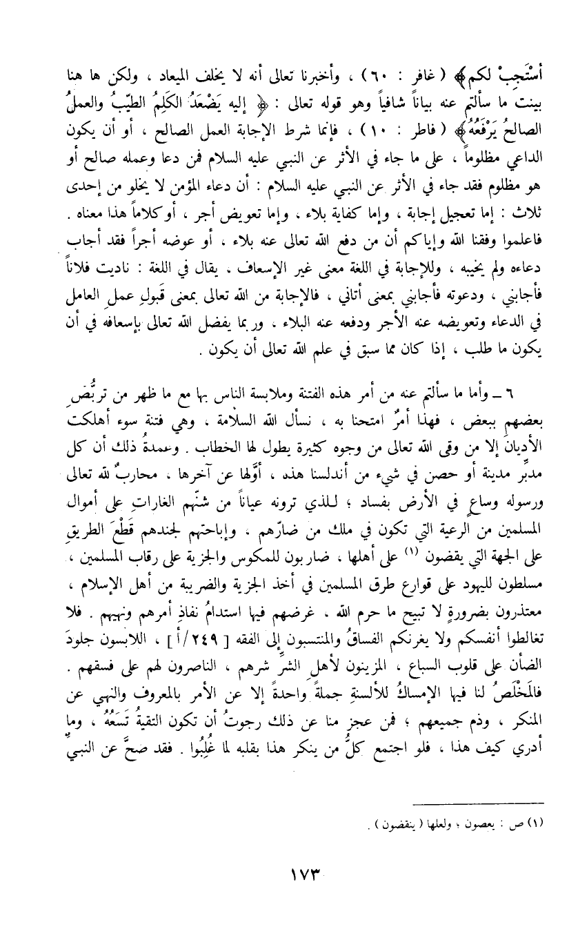 أستجب لكم} (غافر: 60) ، وأخبرنا تعالى أنه لا يخلف الميعاد، ولكن ها هنا بينت ما سألتم عنه بياناً شافياً وهو قوله تعالى: {إليه يصعد الكلم الطيب والعمل الصالح يرفعه} (فاطر: 10) ، فإنما شرط الإجابة العمل الصالح، أو أن يكون الداعي مظلوماً، على ما جاء في الأثر عن النبي عليه السلام فمن دعا وعمله صالح أو هو مظلوم فقد جاء في الأثر عن النبي عليه السلام: أن دعاء المؤمن لا يخلو من إحدى ثلاث: إما تعجيل إجابة، وإما كفاية بلاء، وإما تعويض أجر، أو كلاماً هذا معناه. فاعلموا وفقنا الله وإياكم أن من دفع الله تعالى عنه بلاء، أو عوضه أجراً فقد أجاب دعاءه ولم يخيبه، وللإجابة في اللغة معنى غير الإسعاف، يقال في اللغة: ناديت فلاناً فأجابني، ودعوته فأجابني بمعنى أتاني، فالإجابة من الله تعالى بمعنى قبول عمل العامل في الدعاء وتعويضه عنه الأجر ودفعه عنه البلاء، وربما يفضل الله تعالى بإسعافه في أن يكون ما طلب، إذا كان مما سبق في علم الله تعالى أن يكون.