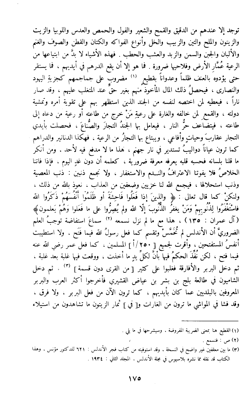 توجد إلا عندهم من الدقيق والقمح والشعير والفول والحمص والعدس واللوبيا والزيت والزيتون والملح والتين والزبيب والخل وأنواع الفواكه والكتان والقطن والصوف والغنم والألبان والجبن والسمن والزبد والعشب والحطب. فهذه الأشياء لابد من ابتياعها من الرعية عمار الأرض وفلاحيها ضرورة. فما هو إلا أن يقع الدرهم في أيديهم، فما يستقر حتى يؤدوه بالعنف ظلماً وعدواناً بقطيع (1) مضروب على جماجمهم كجزية اليهود والنصارى، فيحصل ذلك المال المأخوذ منهم حق عند المتغلب عليهم، وقد صار ناراً، فيعطيه لمن أختصه لنفسه من الجند الذين استظهر بهم على تقوية أمره وتمشية دولته، والقمع لمن خالفه والغارة على رعية من خرج من طاعته أو رعية من دعاه إلى طاعته، فيتضاعف حر النار، فيعامل بها الجند التجار والصناع، فحصلت بأيدي التجار عقارب وحيات وأفاعي، ويبتاع بها التجار من الرعية، فهكذا الدنانير والدراهم كما ترون عياناً دواليب تستدير في نار جهنم، هذا ما لا مدفع فيه لأحد، ومن أنكر ما قلنا بلسانه فحسبه قلبه يعرفه معرفة ضرورية، كعلمه أن دون غد اليوم، فإذا فاتنا الخلاص فلا يفوتنا الاعتراف والندم والاستغفار، ولا نجمع ذنبين: ذنب المعصية وذنب استحلالها، فيجمع الله لنا خزيين وضعفين من العذاب، نعود بالله منذلك، ولنكن كما قال الله تعالى: {والذين إذا فعلوا فاحشة أو ظلموا أنفسهم ذكروا الله فاستغفروا لذنوبهم ومن يغفر الذنوب إلا الله ولم يصروا على ما فعلوا وهم يعلمون} (آل عمران: 135) ، هذا مع ما لم نزل نسمعه (2) سماع استفاضة توجب العلم الضروري أن الأندلس لم تخمس وتقسم كما فعل رسول الله فيما فتح، ولا استطيبت أنفس المستفتحين، وأقرت لجميع [250/أ] المسلمين، كما فعل عمر رضي الله عنه فيما فتح، لكن نفذ الحكم فيها بان لكل يد ما أخذت، ووقعت فيها غلبة بعد غلبة، ثم دخل البربر والأفارقة فغلبوا على كثير [من القرى دون قسمة] (3) ، ثم دخل الشاميون في طالعة بلج بن بشر بن عياض القشيري فأخرجوا اكثر العرب والبربر المعروفين بالبلديين عما كان بأيديهم، كما ترون الآن من فعل البربر، ولا فرق، وقد فشا في المواشي ما ترون من الغارات و [في] ثمار الزيتون ما تشاهدون من استيلاء