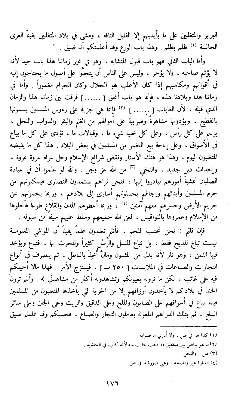 وأما الباب الثاني فهو باب قبول المتشابه، وهو في غير زماننا هذا باب جدي لأنه لا يؤثم صاحبه، ولا يؤجر، وليس على الناس أن يتجنوا على أصول ما يحتاجون إليه في أقواتهم ومكاسبهم إذا كان الأغلب هو الحلال وكان الحرام مغموراً. وأما في زماننا هذا وبلادنا هذه، فإنما هو باب أغلق [] فرقت بين زماننا هذا والزمان الذي قبله، لأن الغايات [..] (2) فإنما هي جزية على رءوس المسلمين يسمونها بالقطيع، ويؤدونها مشاهرة وضريبة على أموالهم من الغنم والبقر والدواب والنحل، يرسم على كل رأس، وعلى كل خلية شيء ما، وقبالات ما، تؤدى على كل ما يباع في الأسواق، وعلى إباحة بيع الخمر من المسلمين في بعض البلاد. هذا كل ما يقبضه المتغلبون اليوم، وهذا هو هتك الأستار ونقض شرائع الإسلام وحل عراه عروة عروة، وإحداث دين جديد، والتخلي (3) من الله عز وجل. والله لو علموا أن في عبادة الصلبان تمشية أمورهم لبادروا إليها، فنحن نراهم يستمدون النصارى فيمكنونهم من حرم المسلمين وأبنائهم ورجالهم يحملونهم أسارى إلى بلادهم، وربما يحمونهم عن حريم الأرض وحسرهم معهم آمنين (4) ، وربما أعطوهم المدن والقلاع طوعاً فأخلوها من الإسلام وعمروها بالنواقيس، لعن الله جميعهم وسلط عليهم سيفاً من سيوفه.