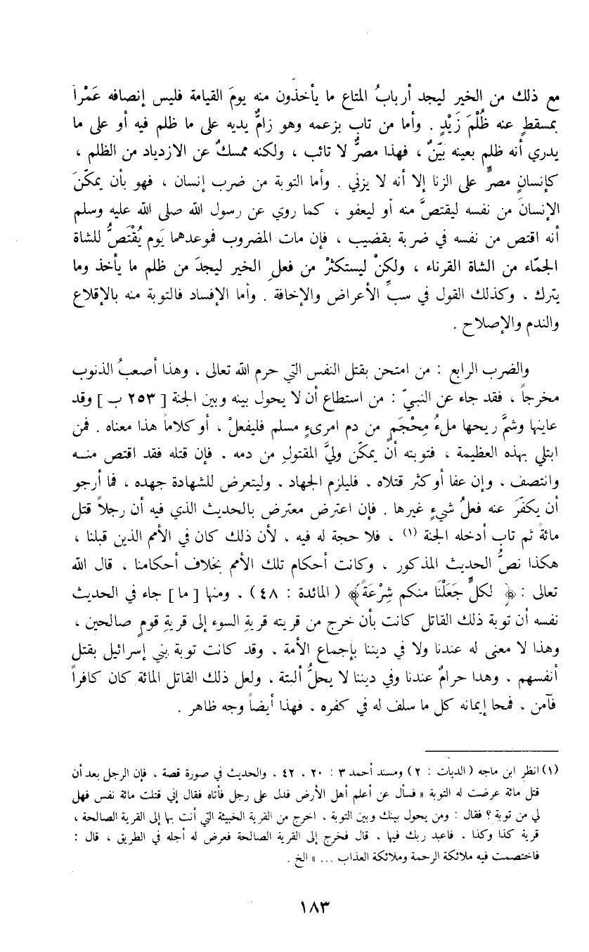 (1) انظر ابن ماجه (الديات: 2) ومسند أحمد 3: 20، 42، والحديث في صورة قصة، فإن الرجل بعد أن قتل مائة عرضت له التوبة " فسأل عن أعلم أهل الأرض فدل على رجل فأتاه فقال إني قتلت مائة نفس فهل لي من توبة فقال: ومن يحول بينك وبين التوبة، اخرج من القرية الخبيثة التي أنت بها إلى القرية الصالحة، قرية كذا وكذا، فاعبد ربك فيها، قال فخرج إلى القرية الصالحة فعرض له أجله في الطريق، قال: فاختصمت فيه ملائكة الرحمة وملائكة العذاب " الخ.