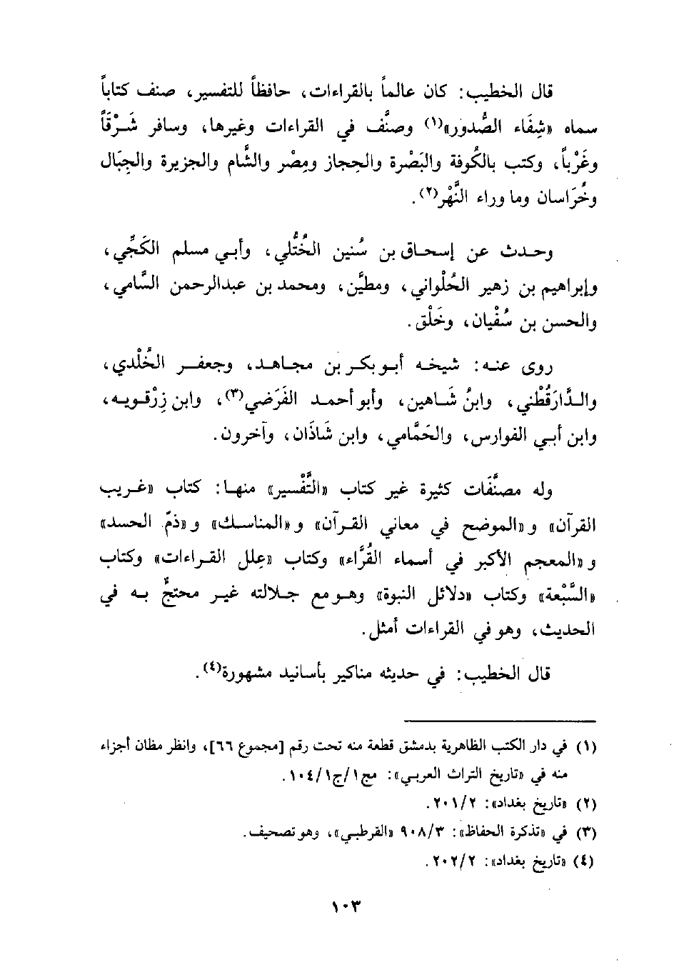 قال الخطيب: كان عالمًا بالقراءات، حافظًا للتفسير، صنف كتابًا سماه "شِفَاء الصُّدور" (¬1) وصنَّف في القراءات وغيرها، وسافر شَرْقًا وغَرْبًا، وكتب بالكُوفة والبَصْرة والحجاز ومِصْر والشَّام والجزيرة والجِبَال وخُرَاسان وما وراء النّهْر (¬2).