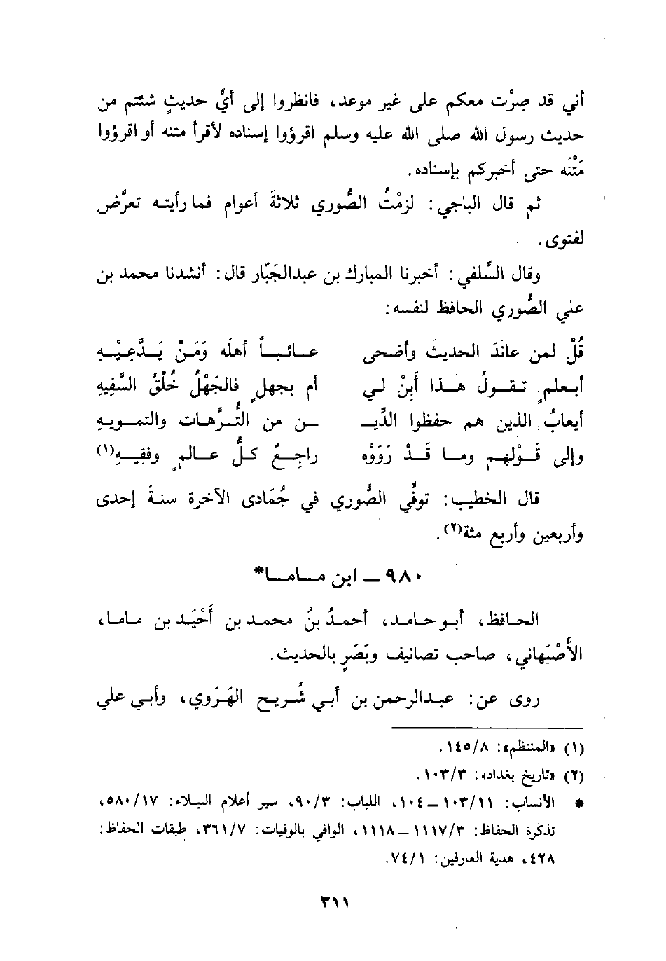 وقال السِّلفي: أخبرنا المبارك بن عبد الجَبّار قال: أنشدنا محمد بن علي الصُّوري الحافظ لنفسه: