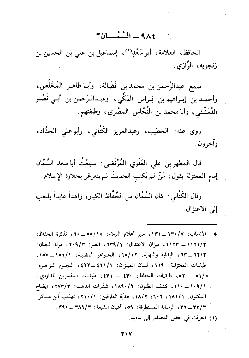 وقال الكَتَّاني: كان السّمَّان من الحُفَّاظ الكبار, زاهدًا عابدًا يذهب إلى الاعتزال.