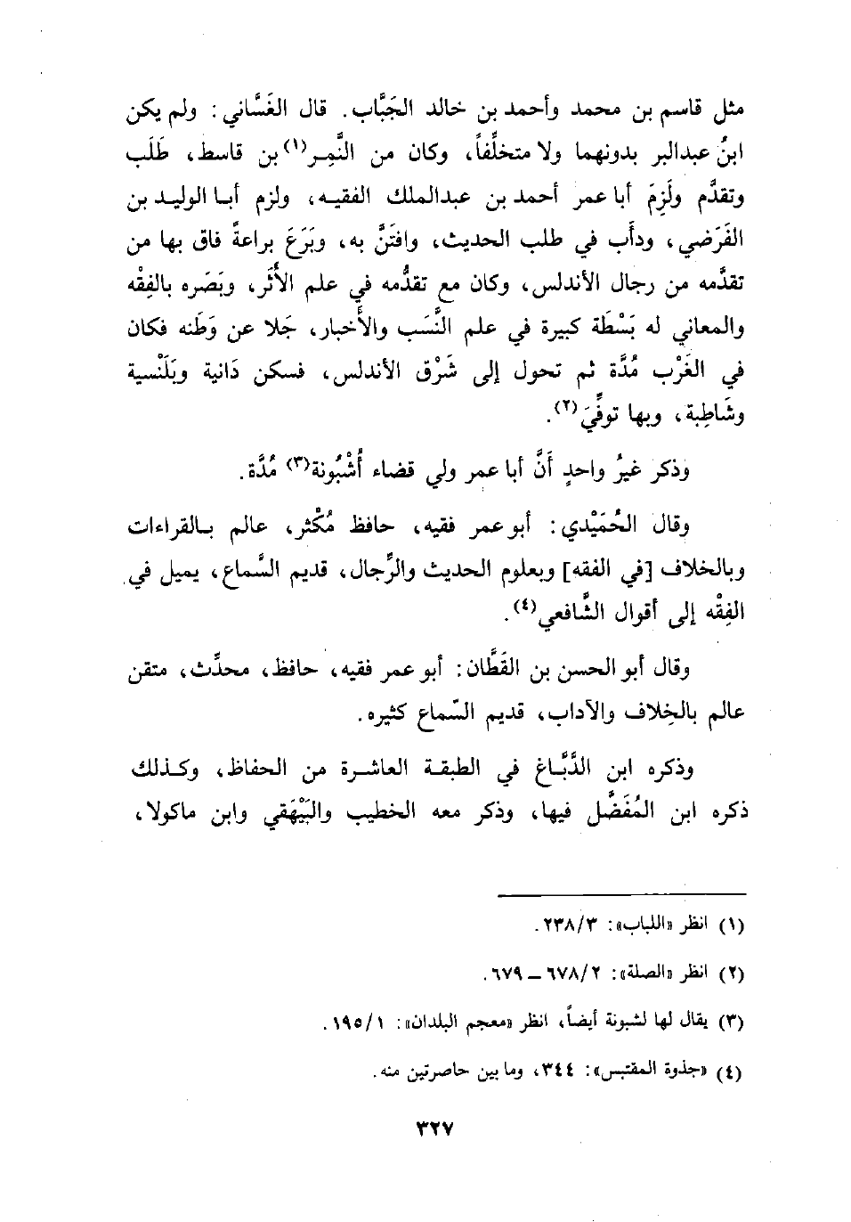 وقال الحُمَيدي: أبو عمر فقيه، حافظ مُكْثر، عالم بالقراءات وبالخلاف [في الفقه] وبعلوم الحديث والرِّجال، قديم السَّماع، يميل في الفِقْه إلى أقوال الشَّافعي (¬4).