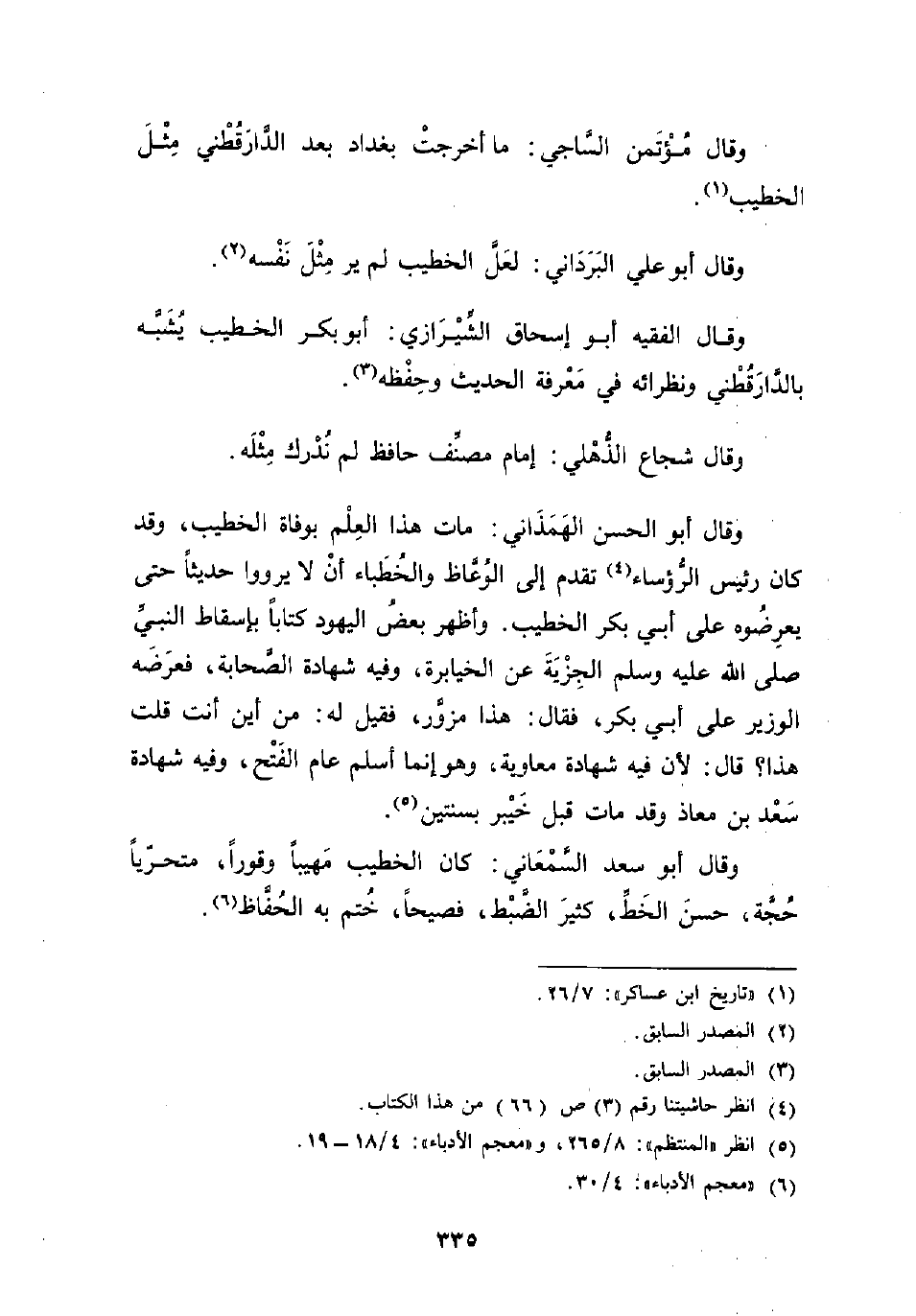 وقال الفقيه أبو إسحاق الشِّيرَازي: أبو بكر الخطيب يُشَبَّه بالدَّارَقُطْني ونظرائه في مَعْرفة الحديث وحِفْظه (¬3).