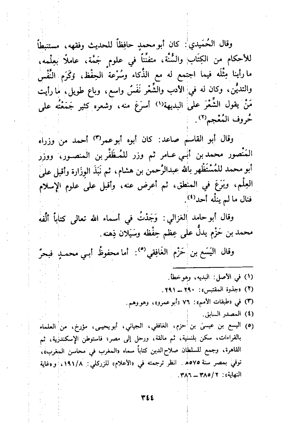 وقال أبو حامد الغزالي: وَجَدْتُ في أسماء الله تعالى كتابًا ألَّفه محمد بن حَزْم يدلُّ على عِظم حِفْظه وسَيَلان ذِهنه.