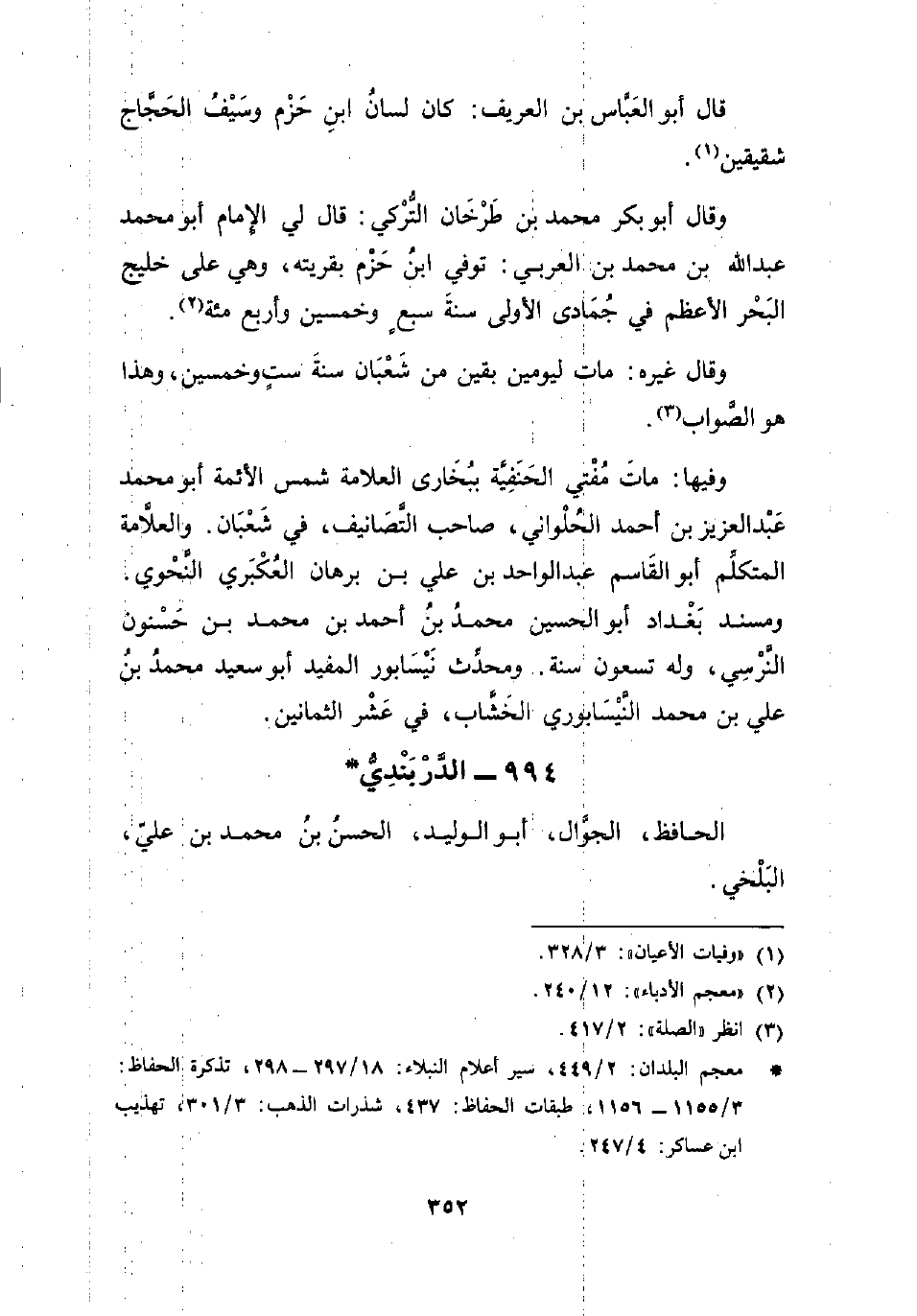 وقال أبو بكر محمد بن طَرْخَان التُّرْكي: قال لي الإمام أبو محمد عبد الله بن محمد بن العربي: توفي ابنُ حَزْم بقريته، وهي على خليج البحْر الأعظم في جُمَادى الأولى سنةَ سبعٍ وخمسين وأربع مئة (¬2).