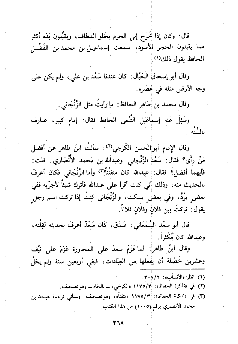 وقال الإمام أبو الحسن الكَرَجي (¬2): سألتُ ابنَ طاهر عن أفضل مَنْ رأَى؟ فقال: سَعْد الزَّنْجاني وعبد الله بن محمد الأَنْصَاري. قلت: فأيهما أفضل؟ فقال: عبد الله كان متفنِّنًا (¬3) وأما الزَّنْجَاني فكان أعرفَ بالحديث منه، وذلك أني كنت أقرأ على عبد الله فأترك شيئًا لأجرّبه ففي بعض يرُدُّ، وفي بعضٍ يسكت، والزَّنْجَاني كنت إذا تركت اسم رجلٍ يقول: تركتَ بين فلانٍ وفلانٍ فلانًا.