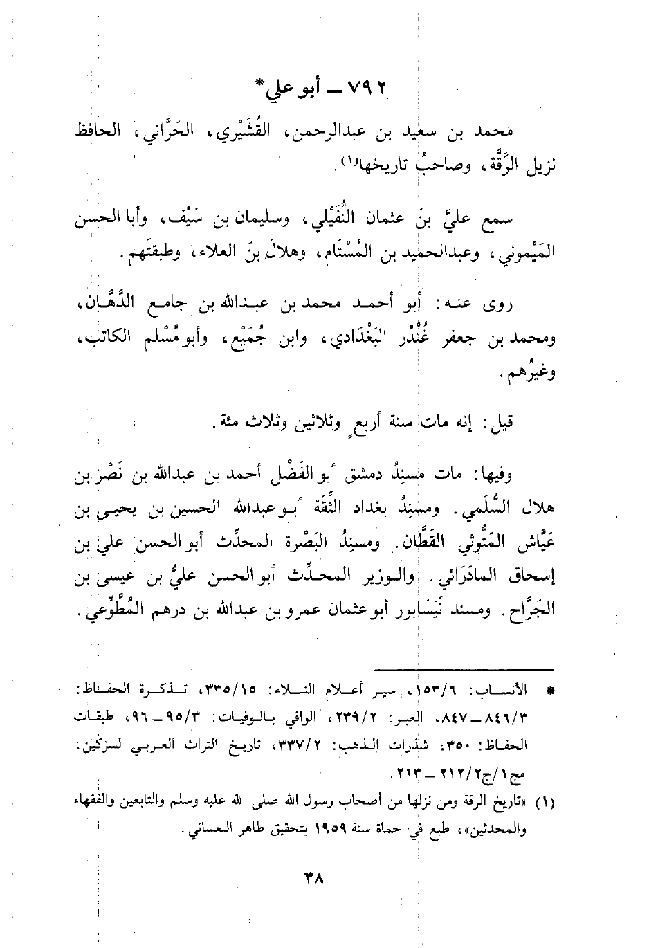 (¬1) "تاريخ الرقة ومن نزلها من أصحاب رسول الله صلى الله عليه وسلم والتابعين والفقهاء والمحدثين" طبع في حماة سنة 1959 بتحقيق طاهر النعساني.