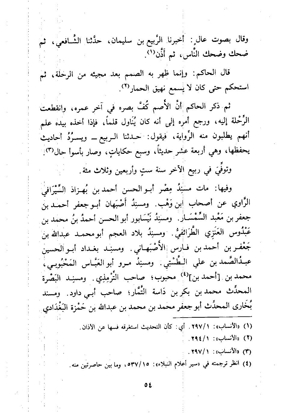 ثم ذكر الحاكم أنَّ الأَصم كُفَّ بصره في آخر عمره، وانقطعت الرِّحْلة إليه، ورجع أمره إلى أنه كان يُنَاول قلمًا، فإذا أخذه بيده علم أنهم يطلبون منه الرِّواية، فيقول: حدثنا الربيع - ويسرُدُ أحاديث يحفظها، وهي أربعة عشر حديثًا، وسبع حكاياتٍ، وصار بأسوأ حال (¬3).