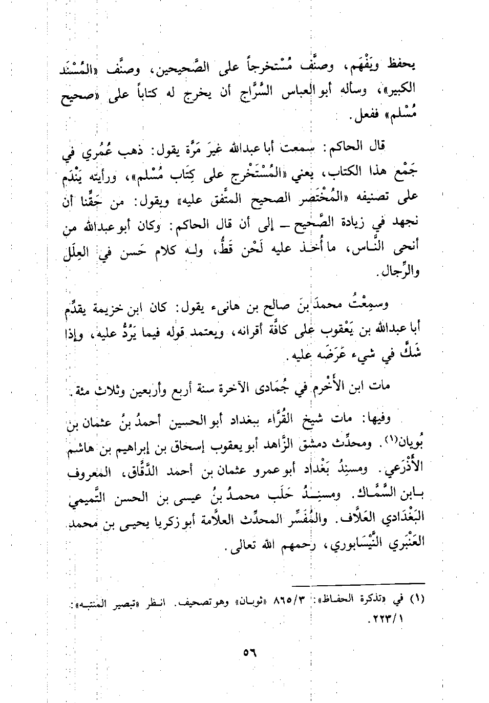 قال الحاكم: سمعت أبا عبد الله غيرَ مَرَّة يقول: ذهب عُمُري في جَمْع هذا الكتاب، يعني "المُسْتَخْرج على كِتَاب مُسْلم"، ورأيته يَنْدَم على تصنيفه "المُخْتَصر الصحيح المتَّفق عليه" ويقول: من حَقِّنا أن نجهد في زيادة الصَّحيح- إلى أن قال الحاكم: وكان أبو عبد الله من أنحى النَّاس، ما أُخذ عليه لَحْن قَطُّ، وله كلام حَسن في العِلَل والرجال.